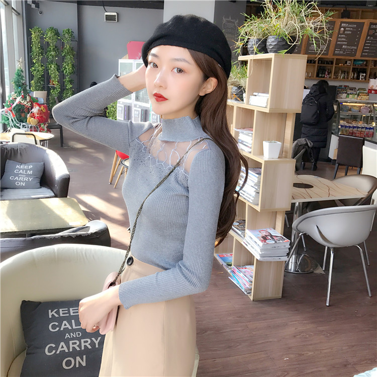 韓國chic秋冬半高領修身縷空燙鉆設計套頭螺紋打底衫針織衫女