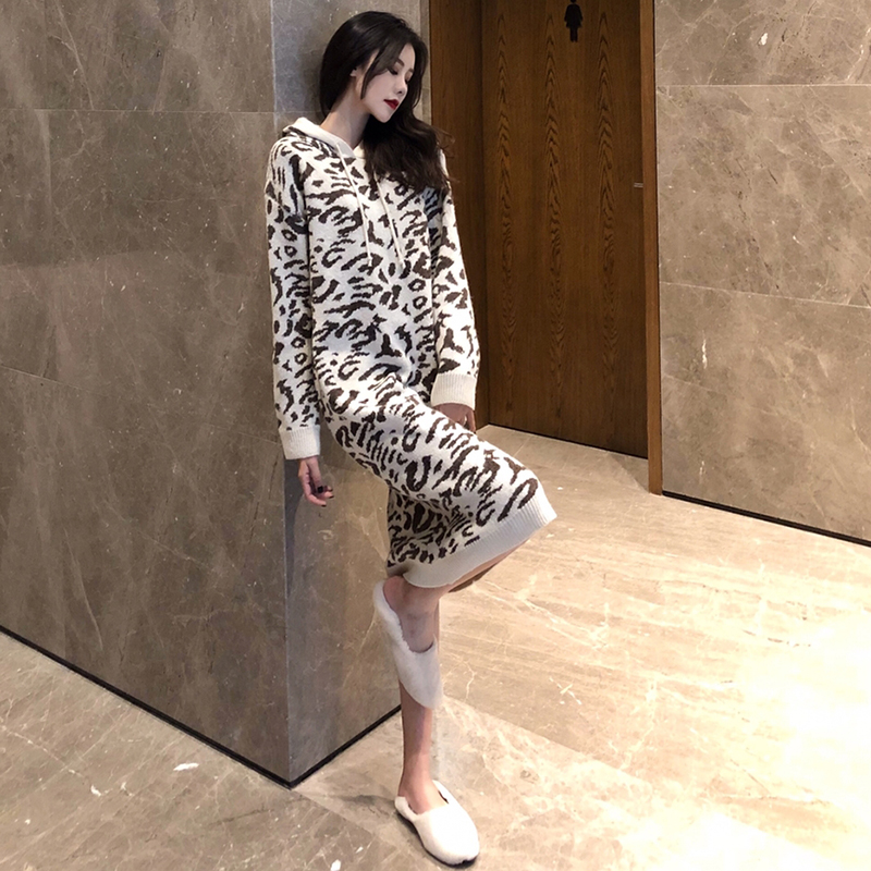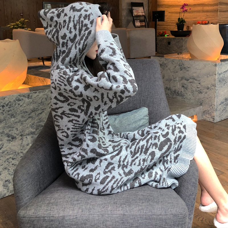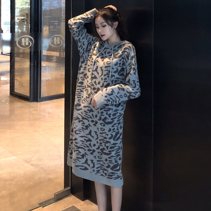 / 復古豹紋寬松長袖連帽針織連衣裙秋冬裝新款法式少女egg毛衣裙子