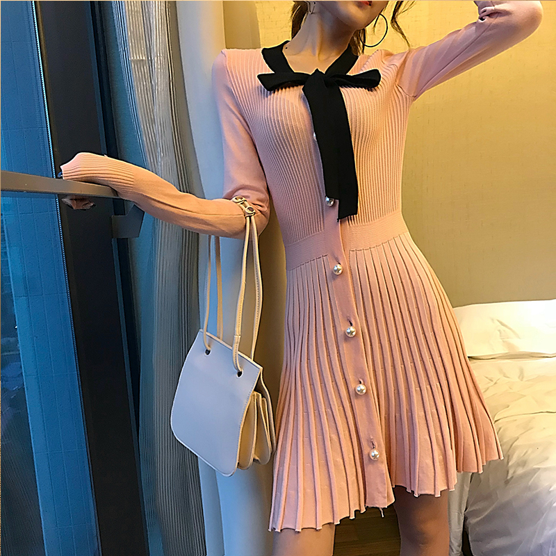 / 氣質時尚2018秋裝新款韓版女短裙蝴蝶結領口收腰顯瘦長袖連衣裙潮