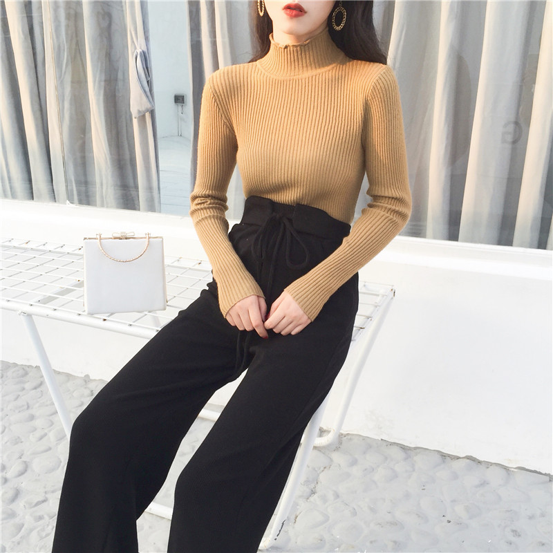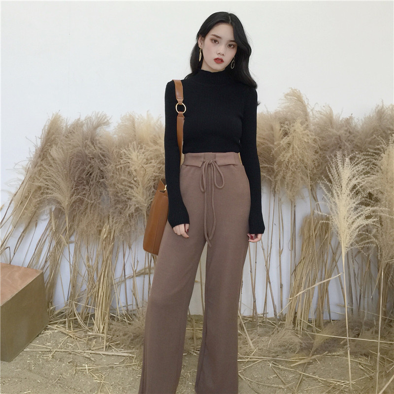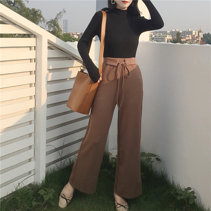 港味復古風2018秋裝新款修身顯瘦高腰系帶針織直筒長褲百搭闊腿褲