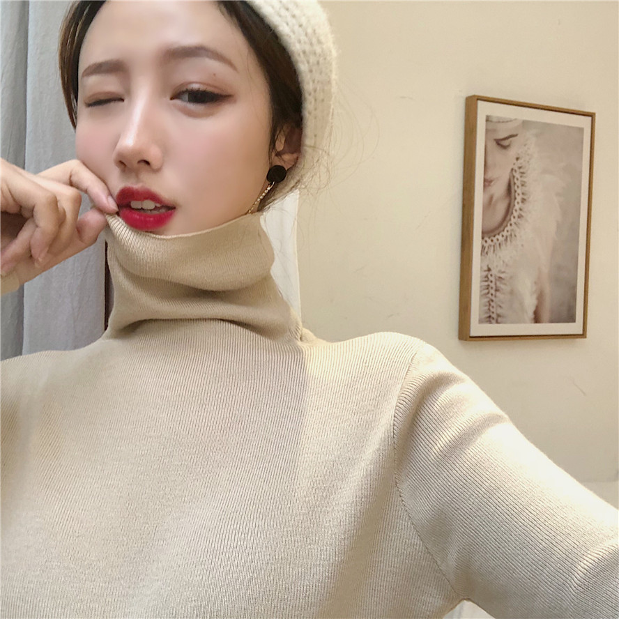 秋冬新款純色百搭高領堆堆領針織衫上衣chic復古簡約長袖打底衫女