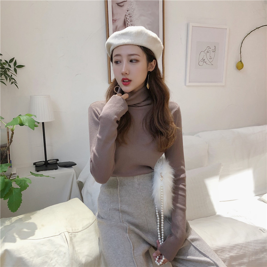 / 秋冬新款純色百搭高領堆堆領針織衫上衣chic復古簡約長袖打底衫女