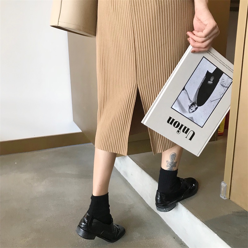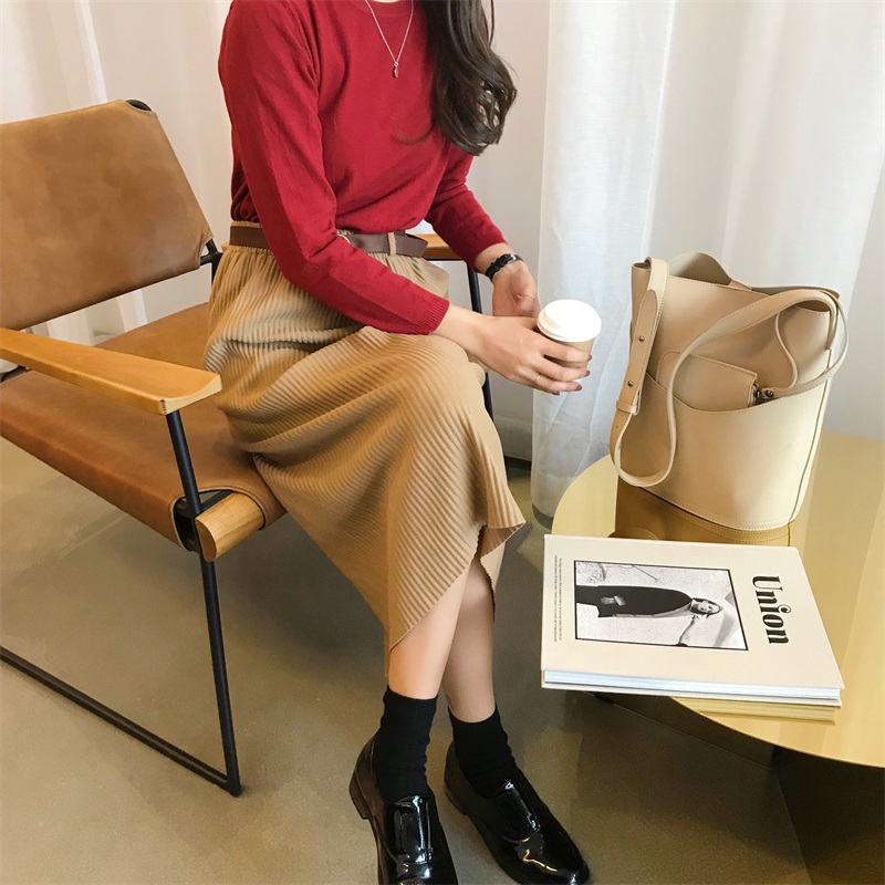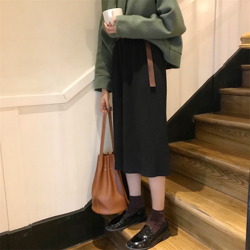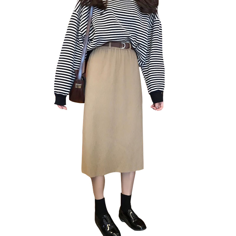 / 秋季韓版松緊腰修身顯瘦半身裙復古高腰純色A字裙長裙學生裙子女
