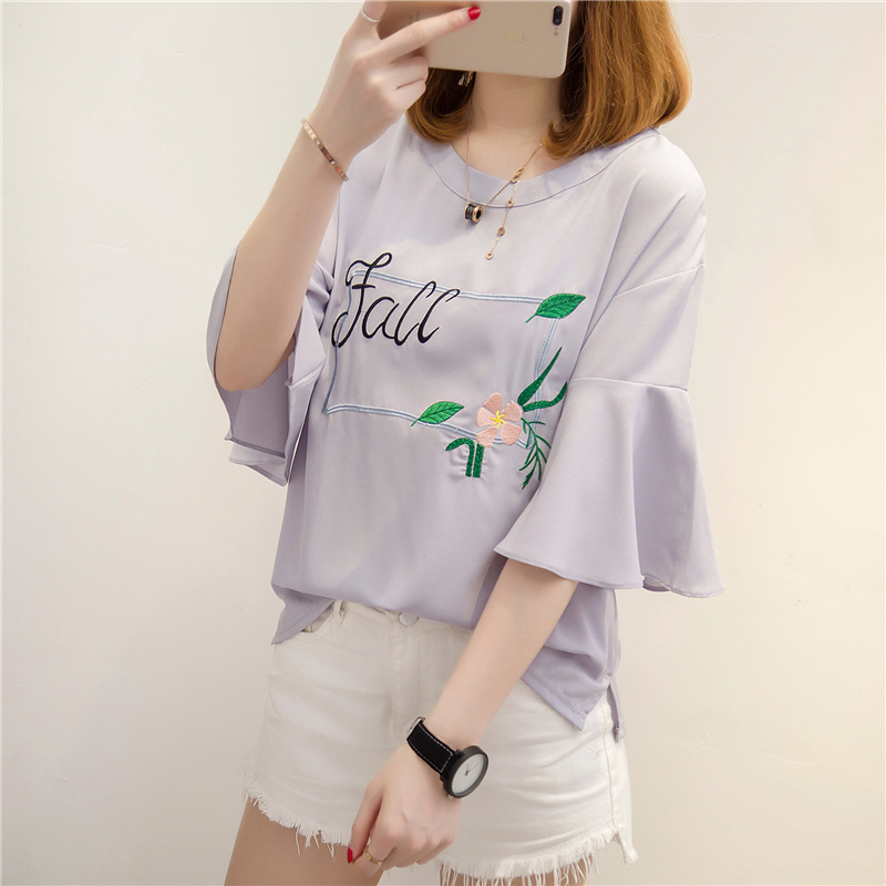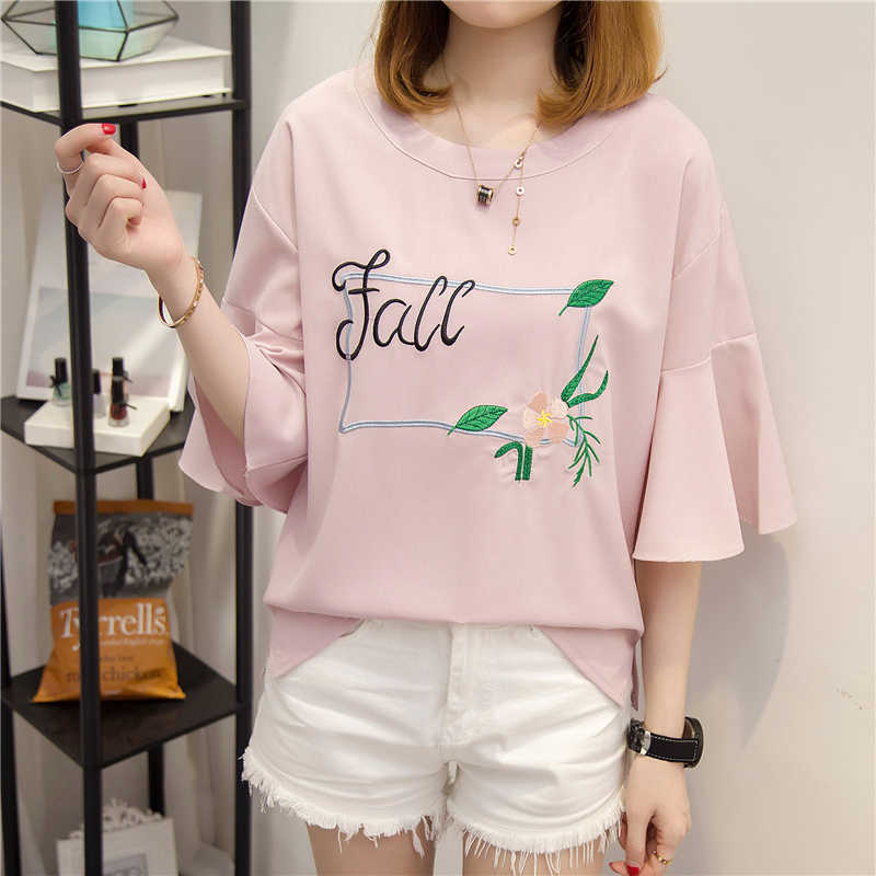 夏裝新款女白色t恤女荷葉袖韓版刺繡bf風小清新上衣體恤短袖