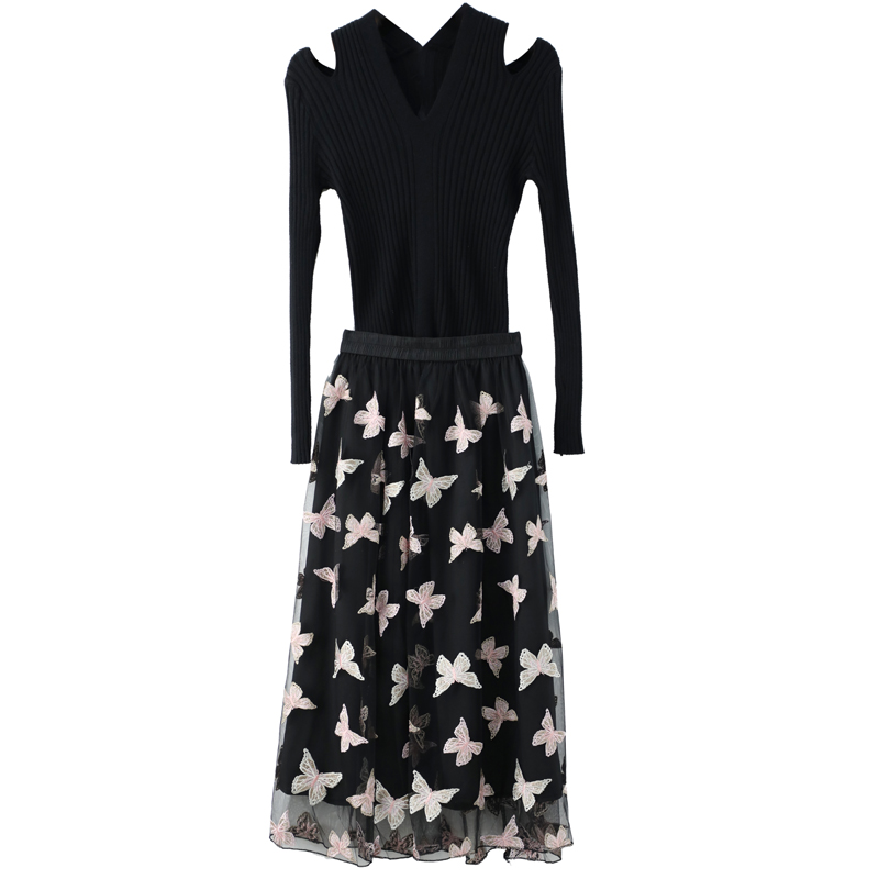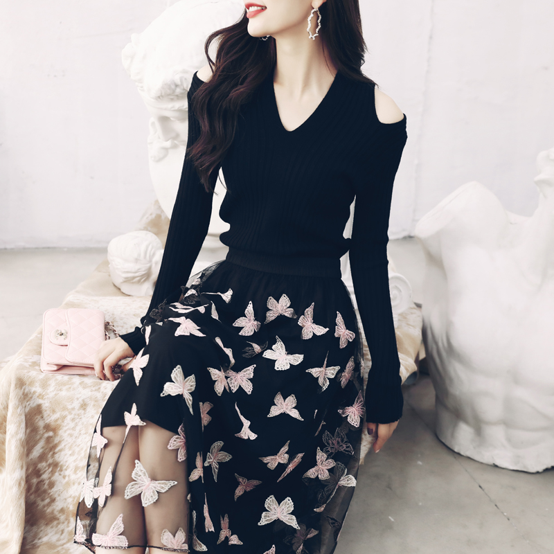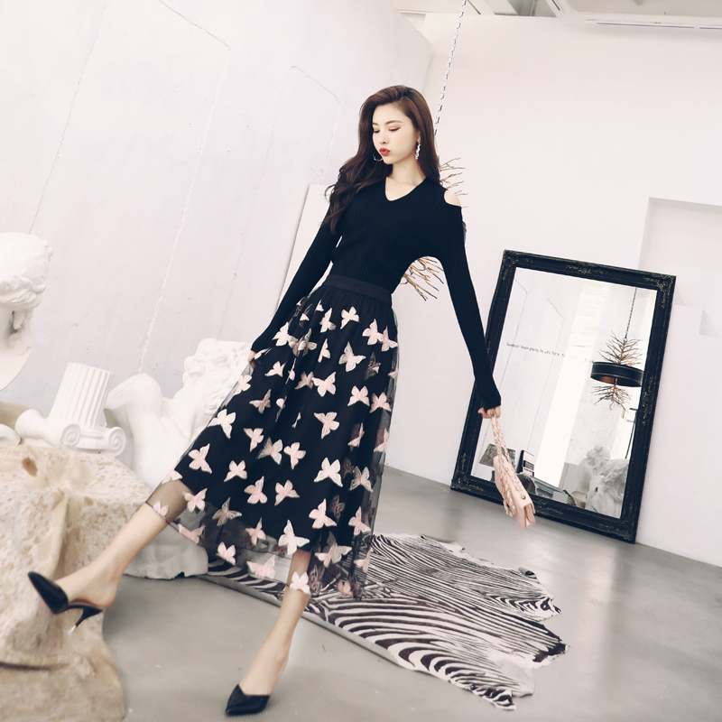 / 2018秋裝新款中長款網紗刺繡蓬蓬半身裙韓版針織長袖露肩上衣套裝
