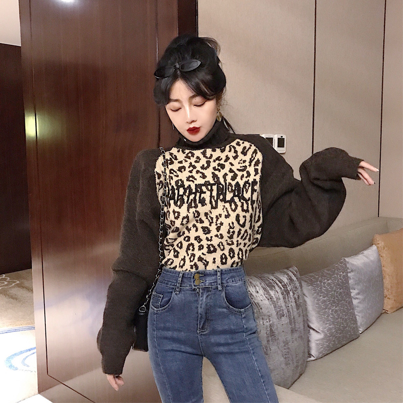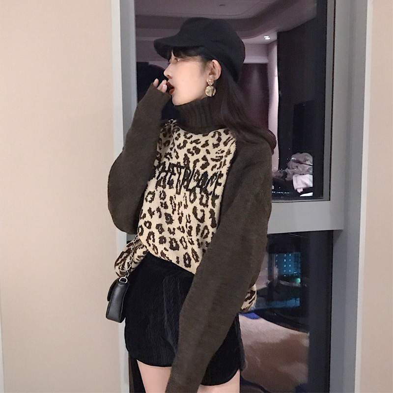 / 2018新款韓版秋冬季chic毛衣女裝高領豹紋拼接長袖套頭寬松針織衫