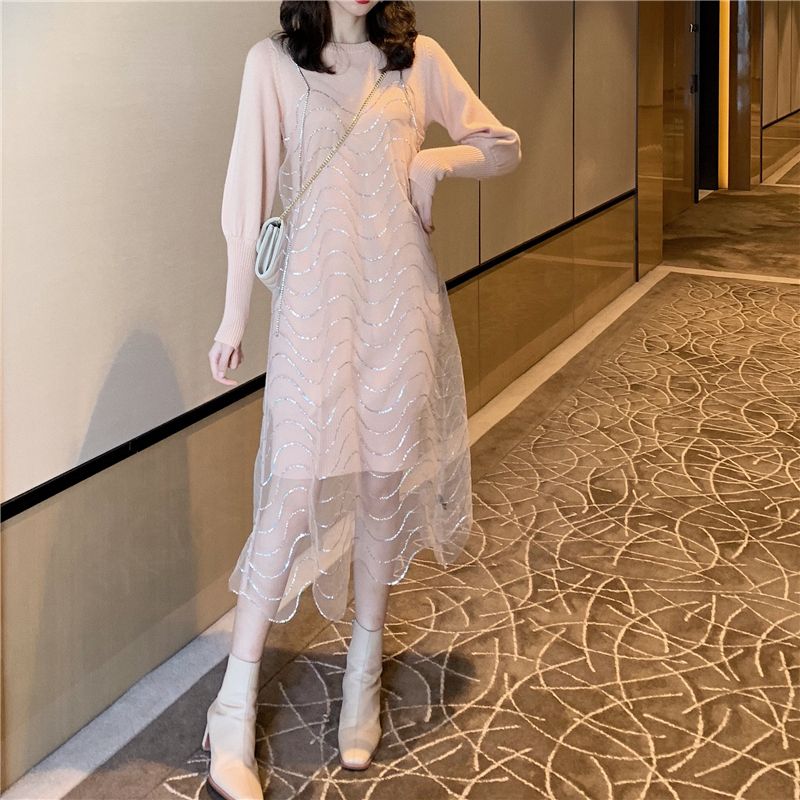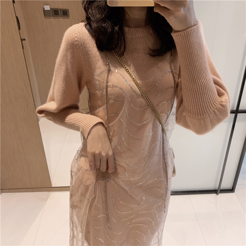 2018秋冬新款韓版時尚套裝溫柔風珠片繡鉆吊帶針織連衣裙兩件套女