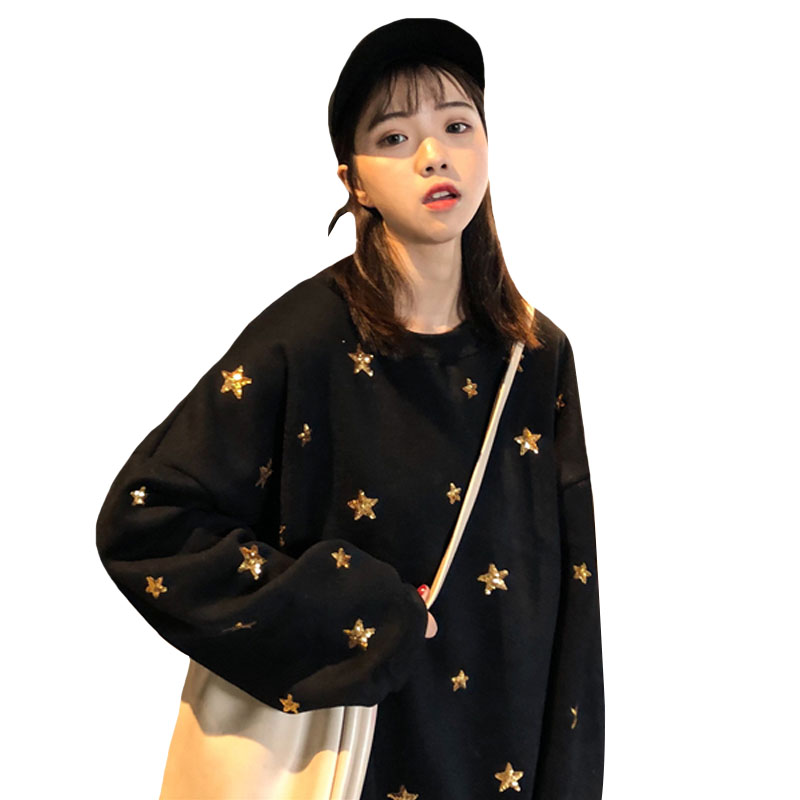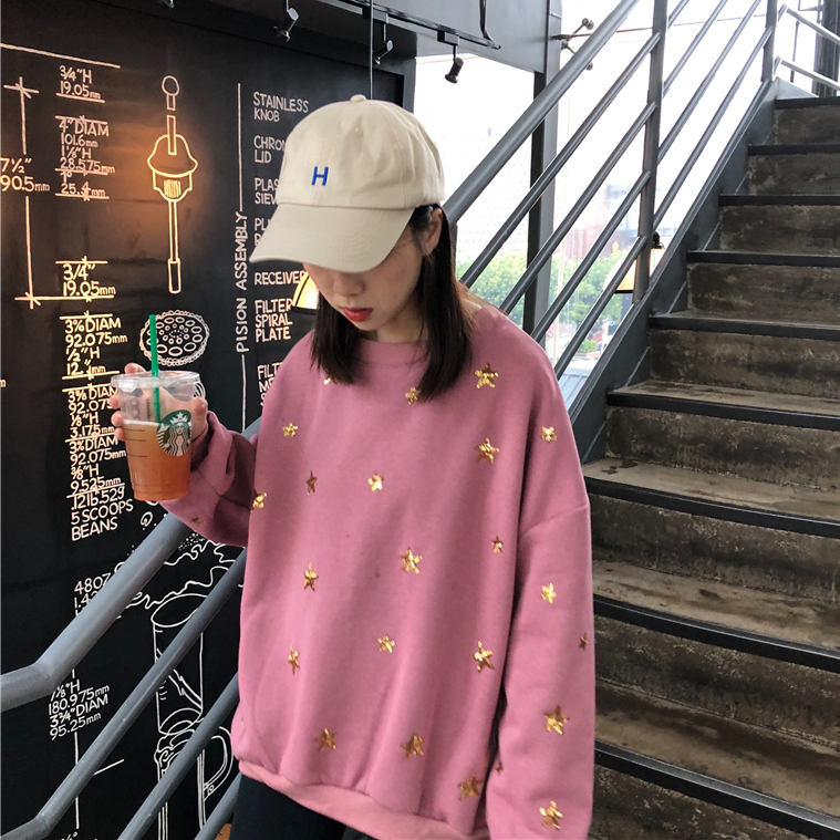 / 秋季女裝韓版寬松重工閃光刺繡星星加絨加厚套頭超火衛衣上衣外套