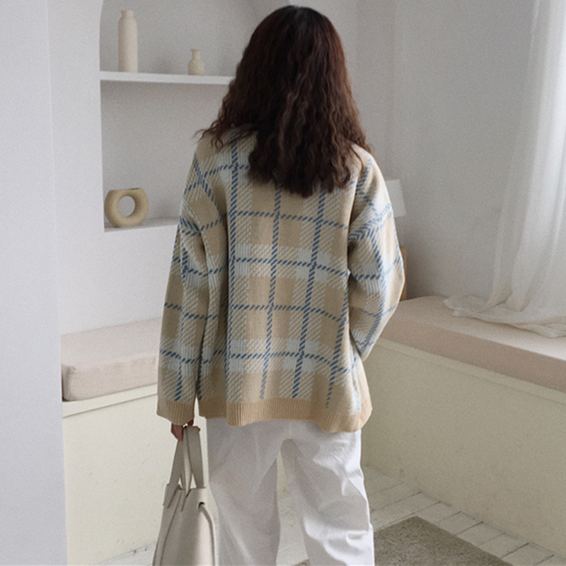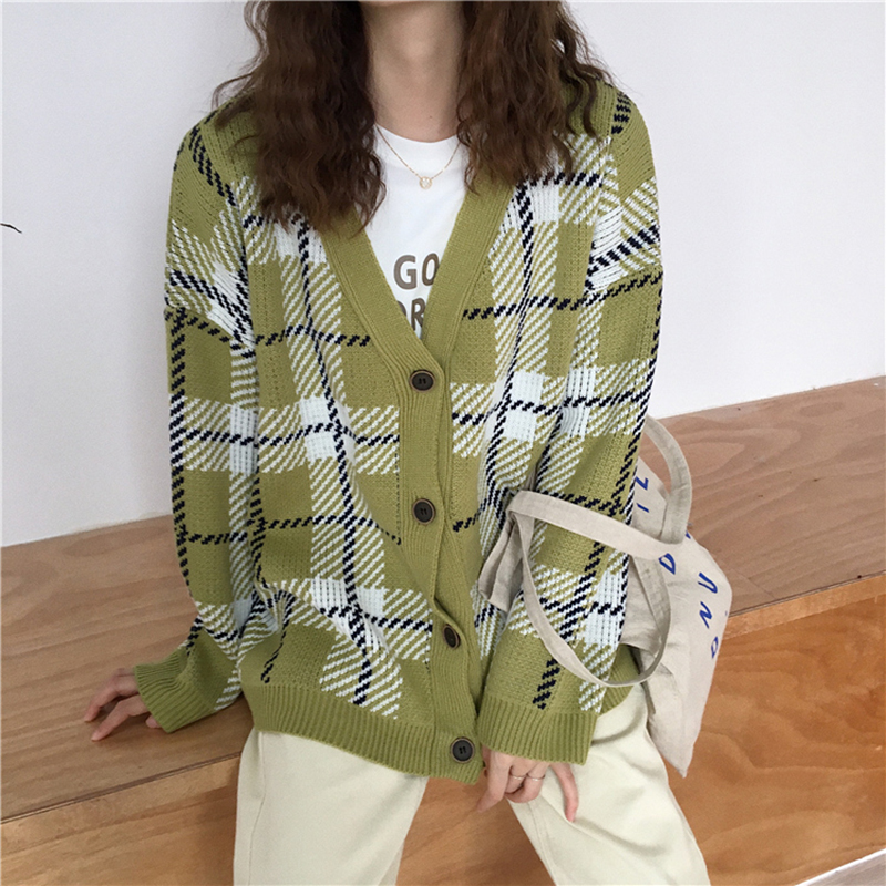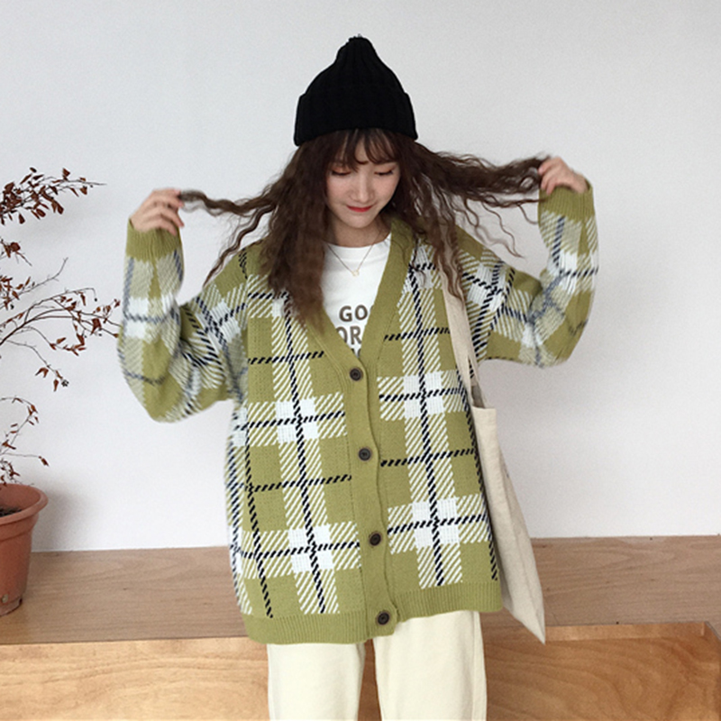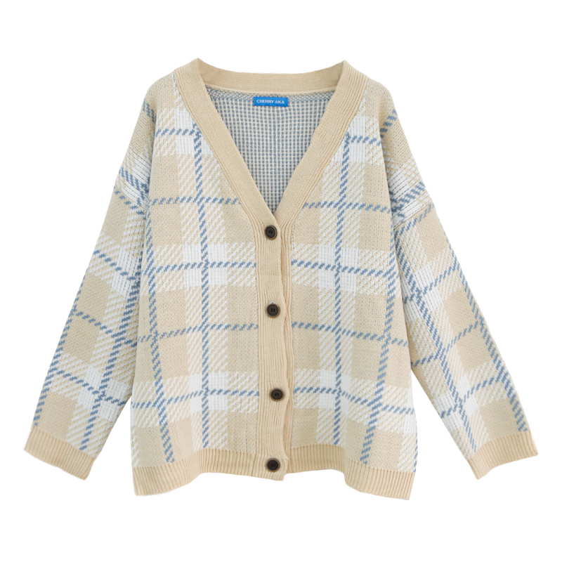 / 秋冬韓版寬松V領格子針織開衫毛衣女裝新款學生時尚長袖外套上衣