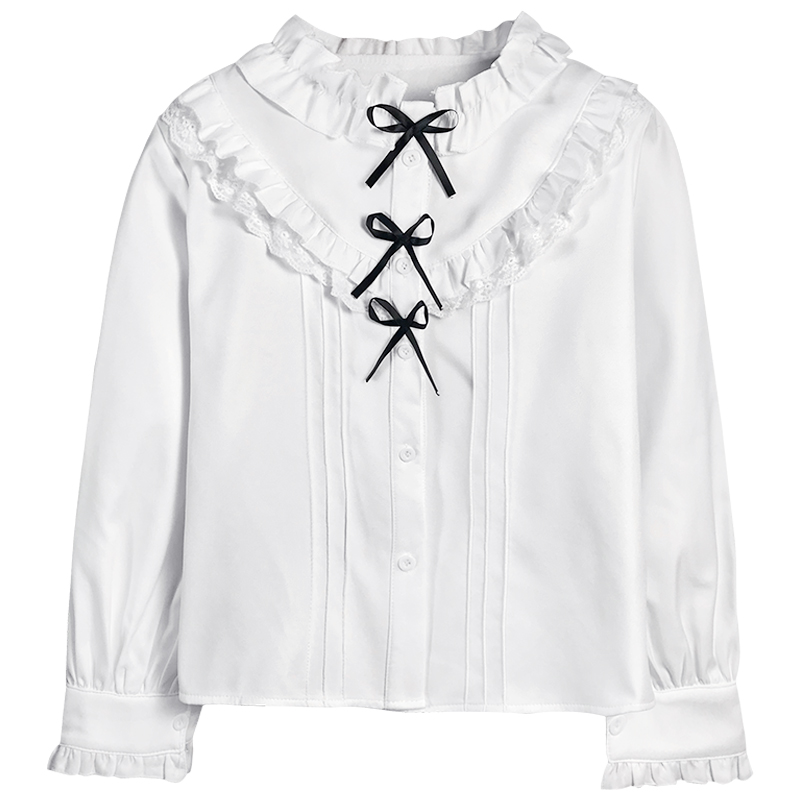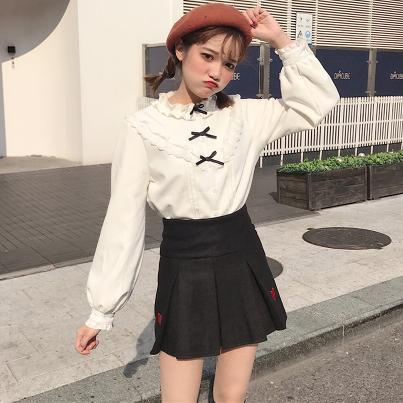 / 清新軟妹加絨白襯衫秋冬2018新款女裝學生木耳邊蝴蝶結燈籠袖上衣