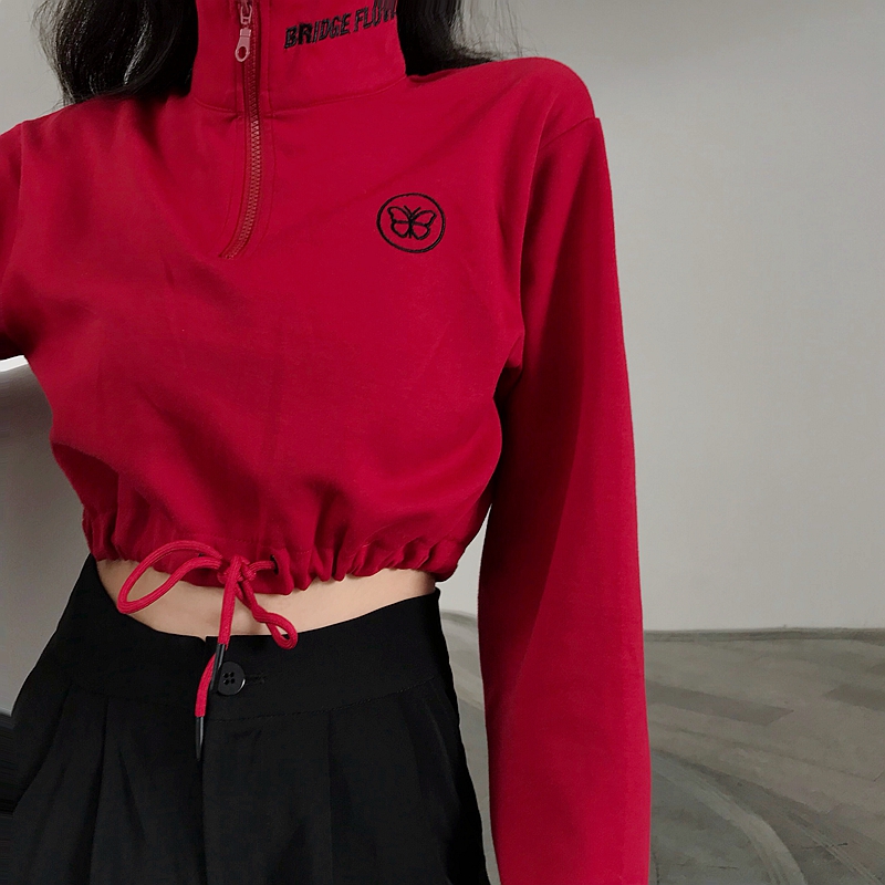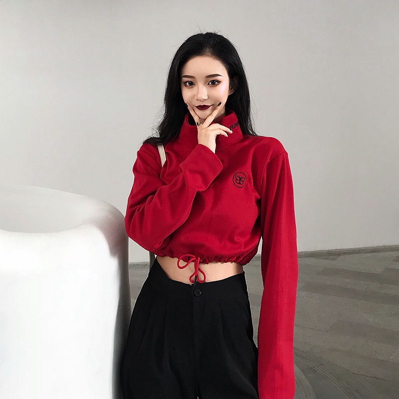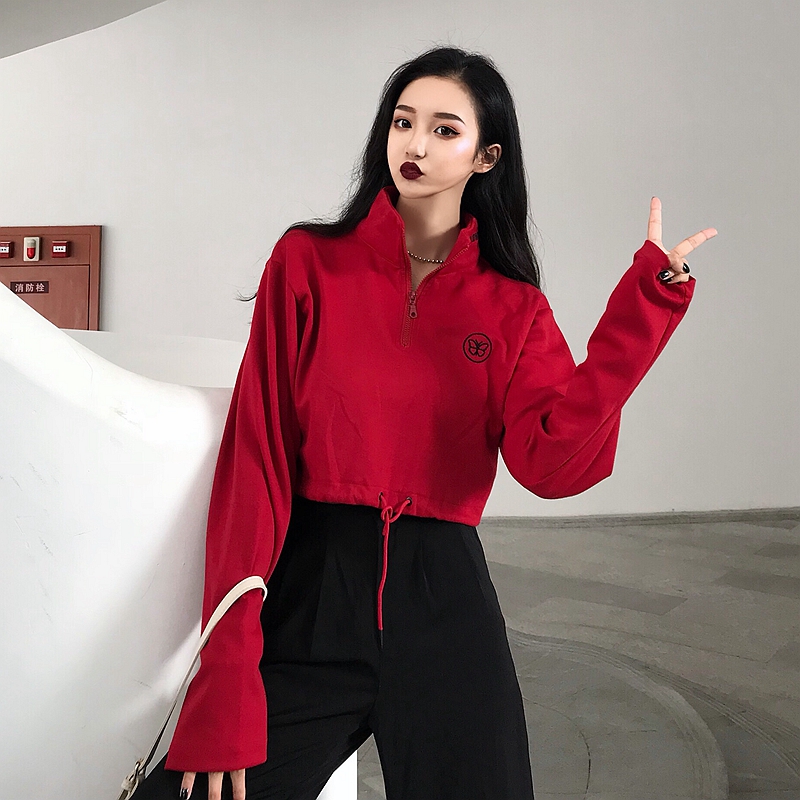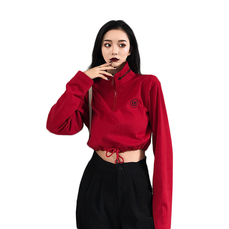 港風時尚早秋衛衣女潮寬松長袖高腰短款收腰露臍半拉鏈小高領上衣