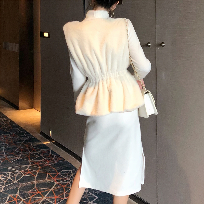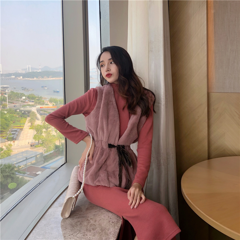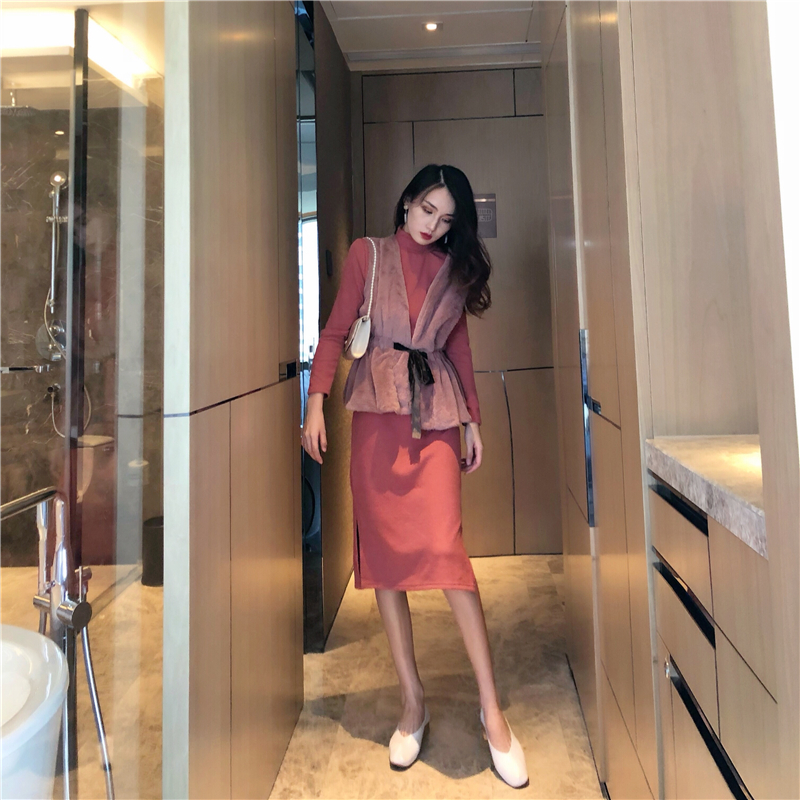 2018新款系帶毛絨背心馬甲長袖側邊開叉針織連衣裙時尚氣質套裝女