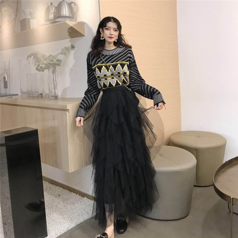 / 女神套裝秋冬新款幾何圖案毛衣+層層網紗半身裙仙女裙時尚兩件套