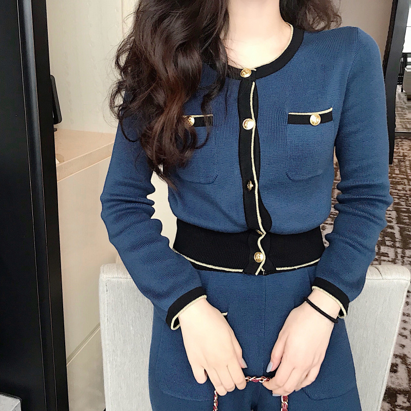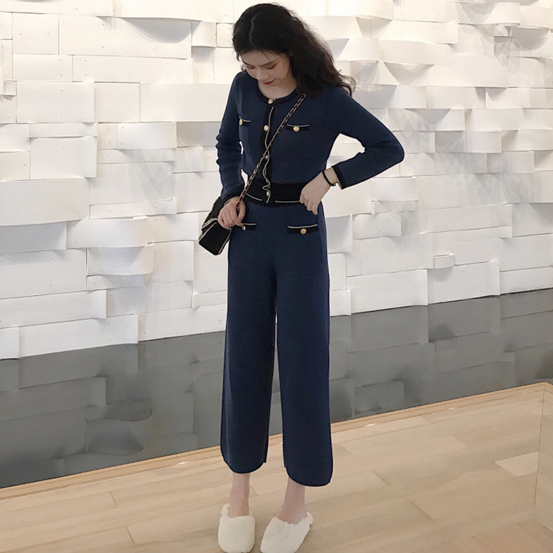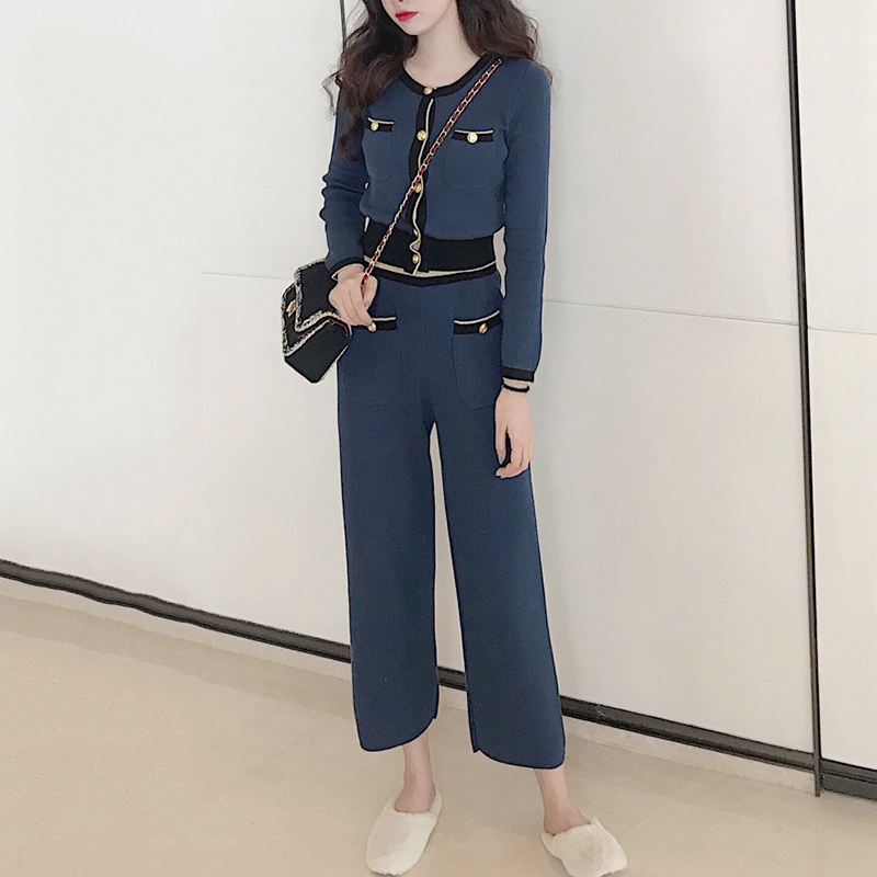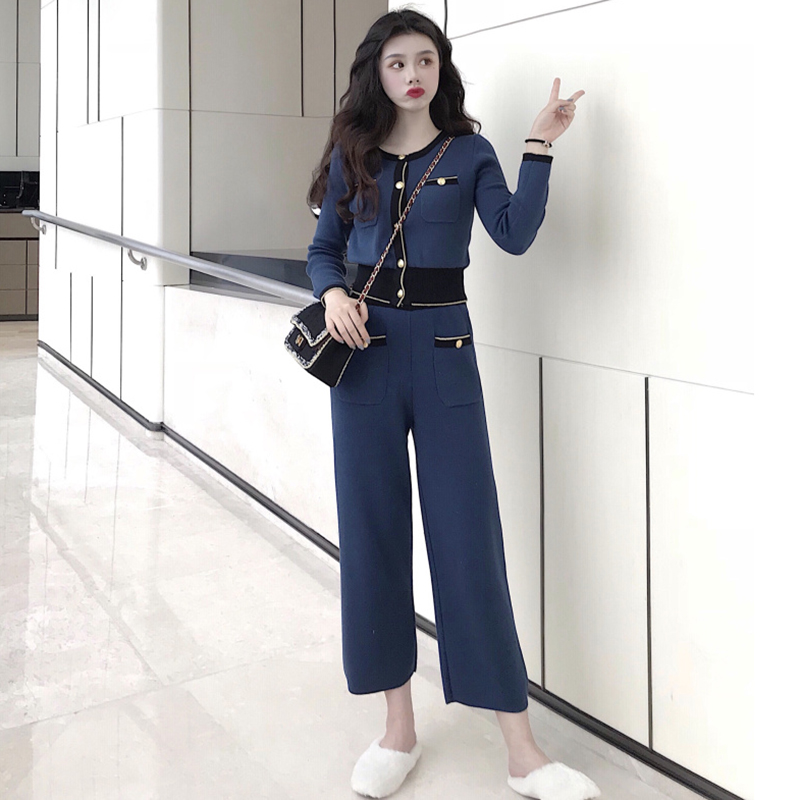 氣質女神兩件套秋冬裝新款時尚拼色修身上衣高腰針織闊腿九分褲子