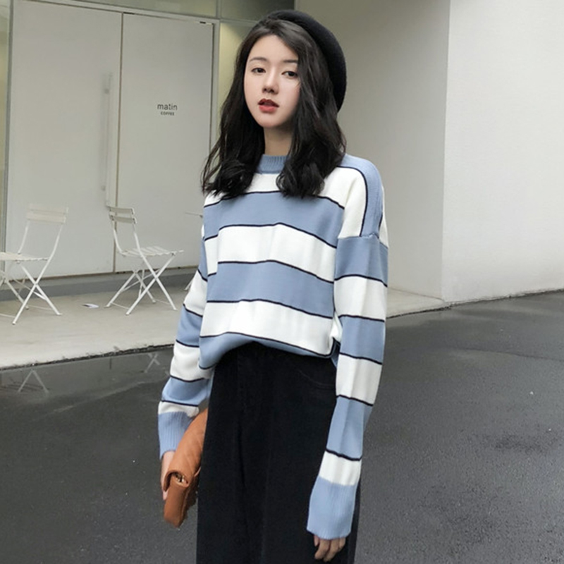 時尚條紋針織衫女秋冬裝新款圓領慵懶風毛衣寬松長袖上衣休閑外套