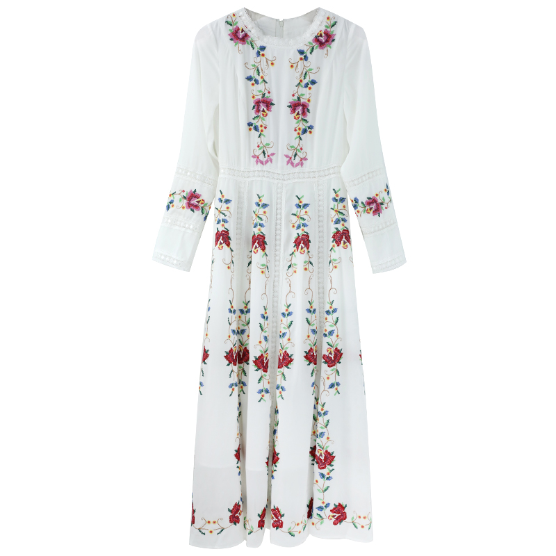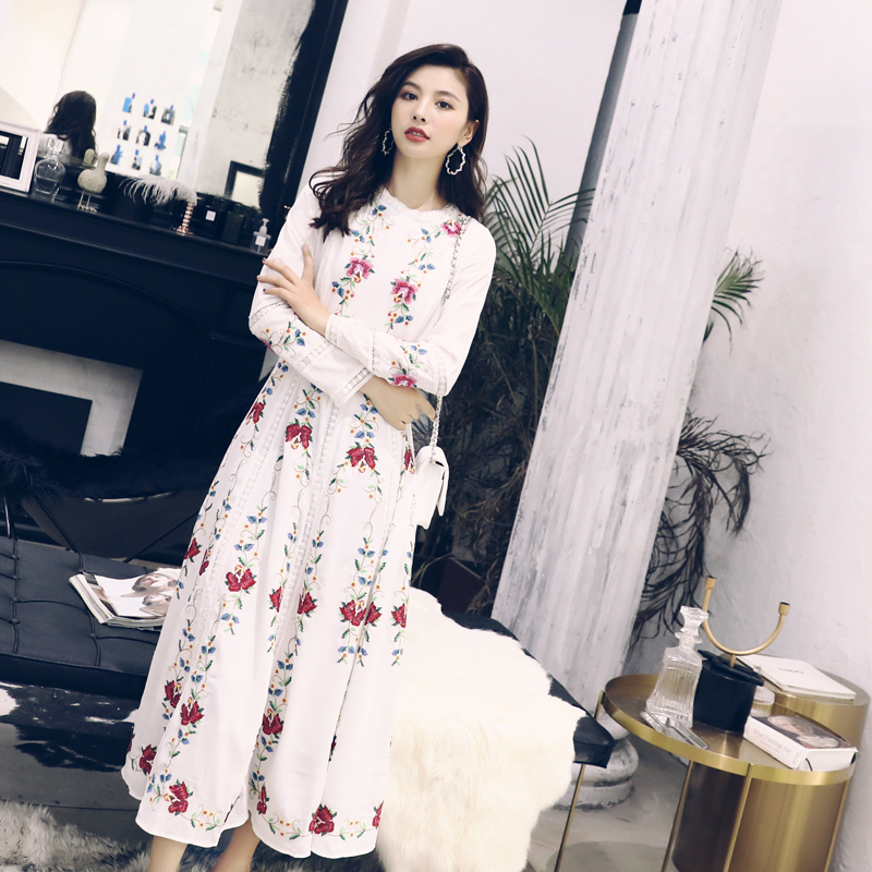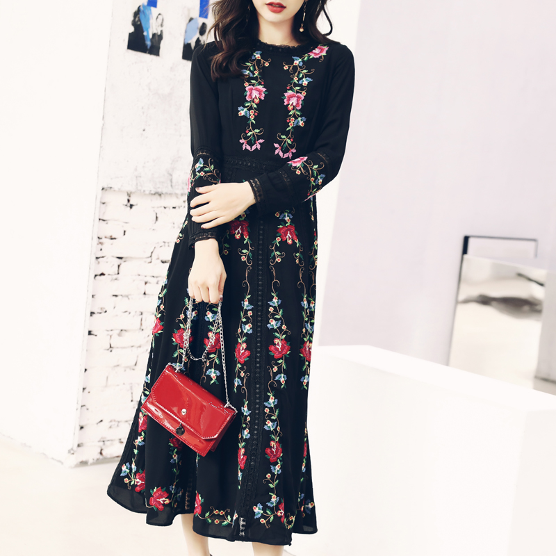 / 2018秋冬季名媛風長裙女裝新款中國風刺繡復古長袖連衣裙優雅裙子