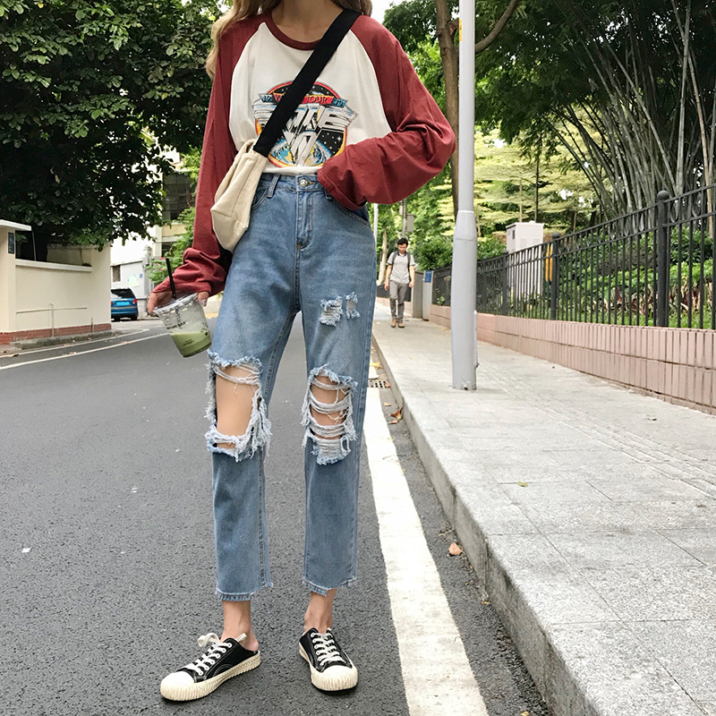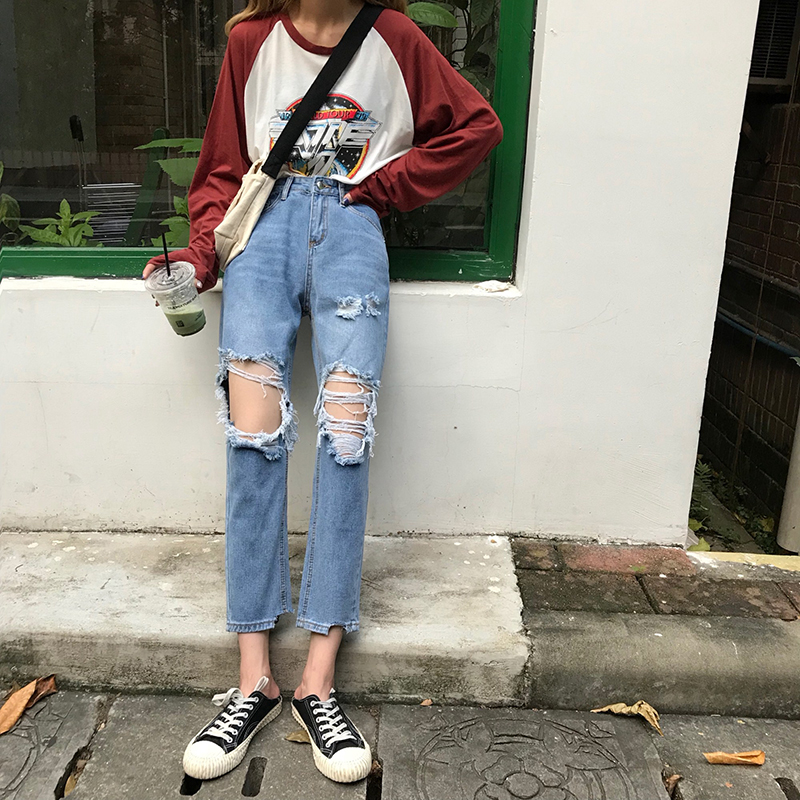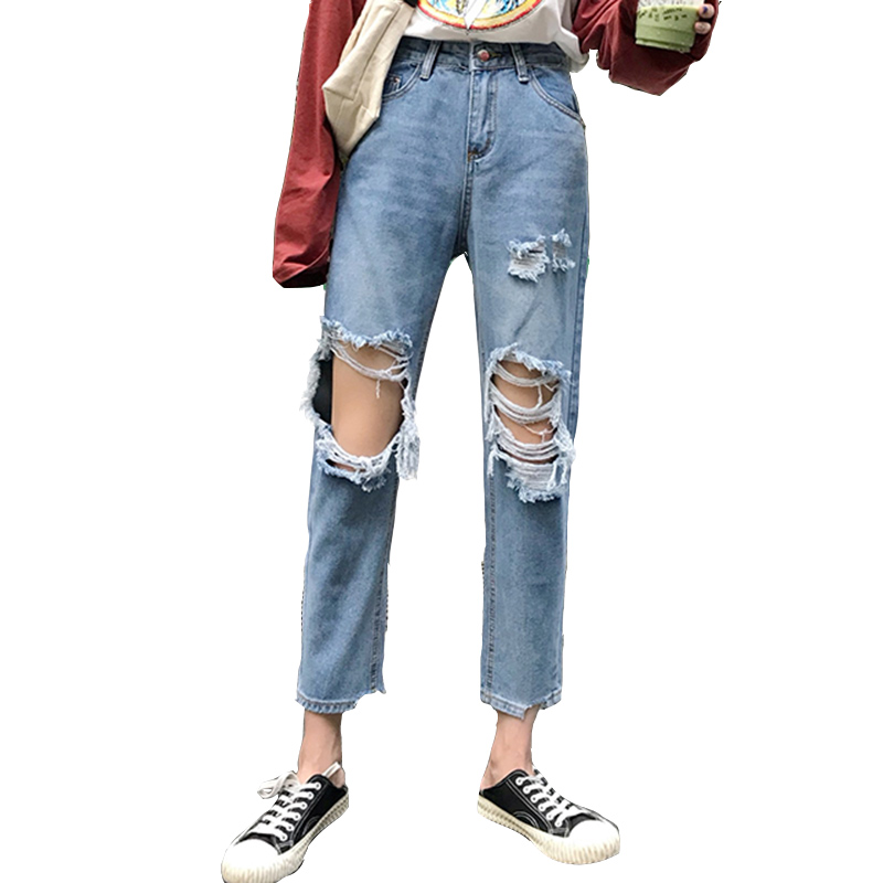長褲女2018夏新款女裝韓版水洗做舊高腰牛仔褲寬松百搭破洞九分褲
