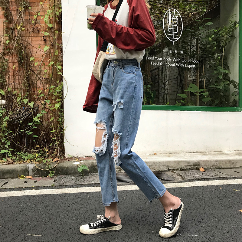 / 長褲女2018夏新款女裝韓版水洗做舊高腰牛仔褲寬松百搭破洞九分褲