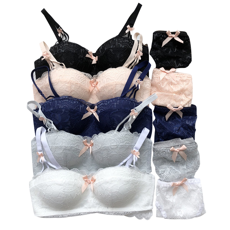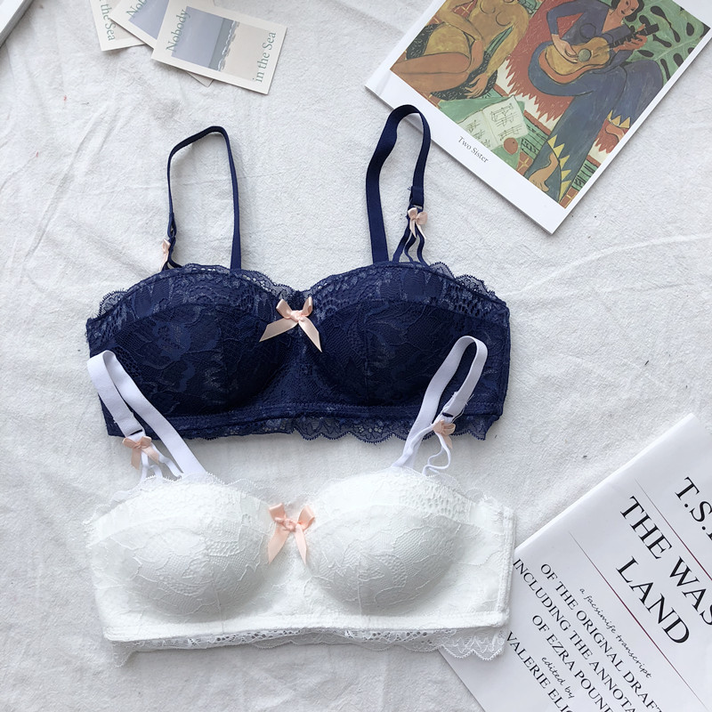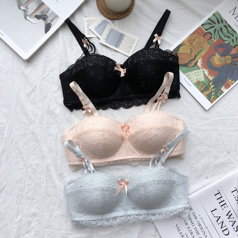 甜美半杯無鋼圈少女內衣套裝蕾絲加厚蝴蝶結雙肩帶小胸聚攏文胸薄