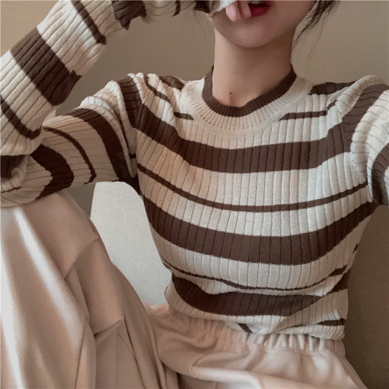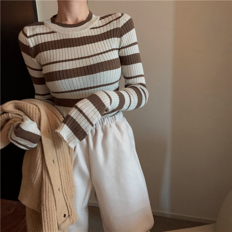 / 打底衫女秋冬季新款修身百搭柔軟條紋撞色長袖圓領保暖針織衫上衣