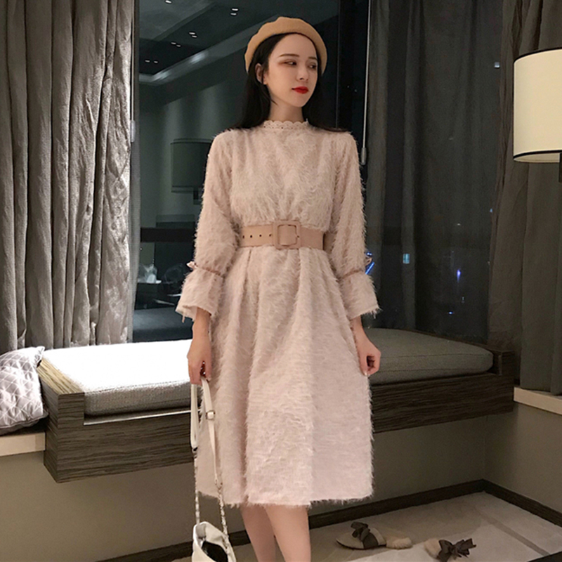 法系少女茶歇裙秋冬裝2018新款高腰中長款花邊立領毛絨A字連衣裙