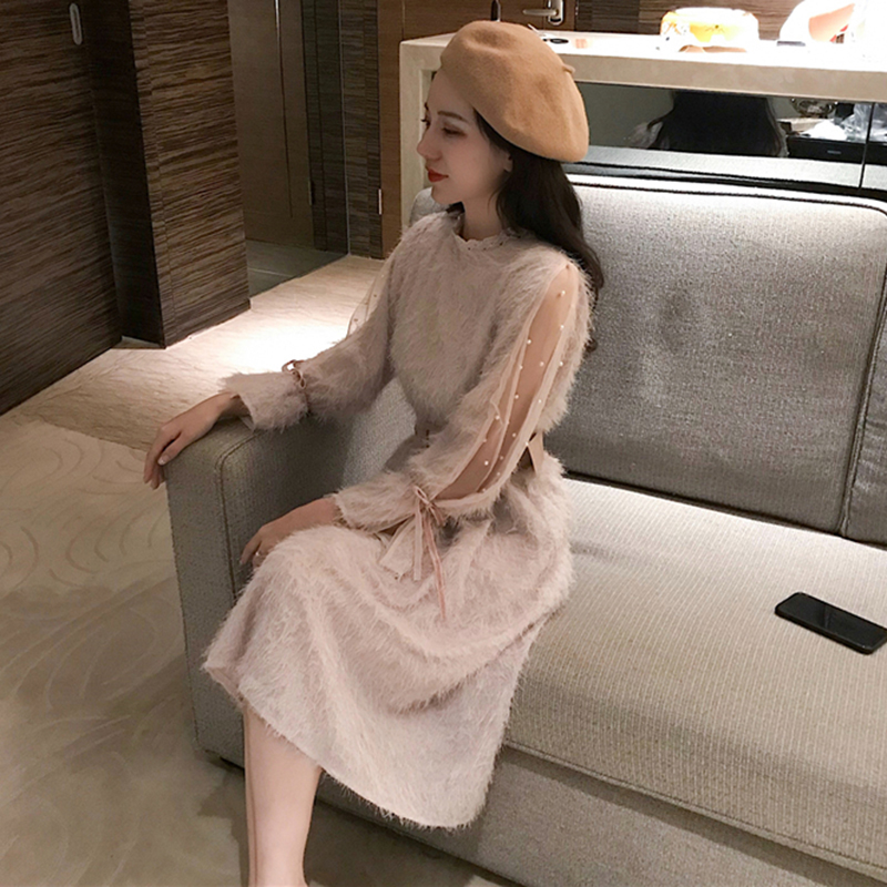 / 法系少女茶歇裙秋冬裝2018新款高腰中長款花邊立領毛絨A字連衣裙