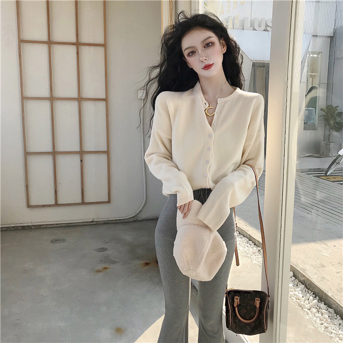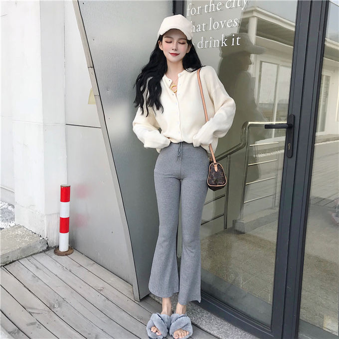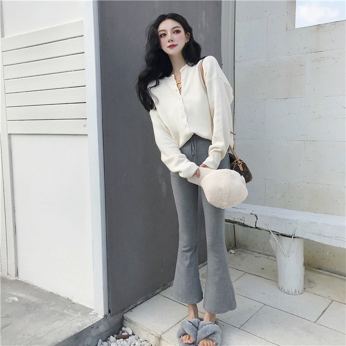 / 網紅單排扣針織毛衣女2018新款開衫外套+高腰休閑褲闊腿褲喇叭褲
