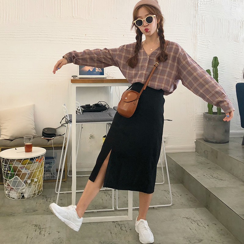 / 秋季女裝韓版氣質高腰純色開叉半身裙松緊腰顯瘦A字裙包臀裙長裙