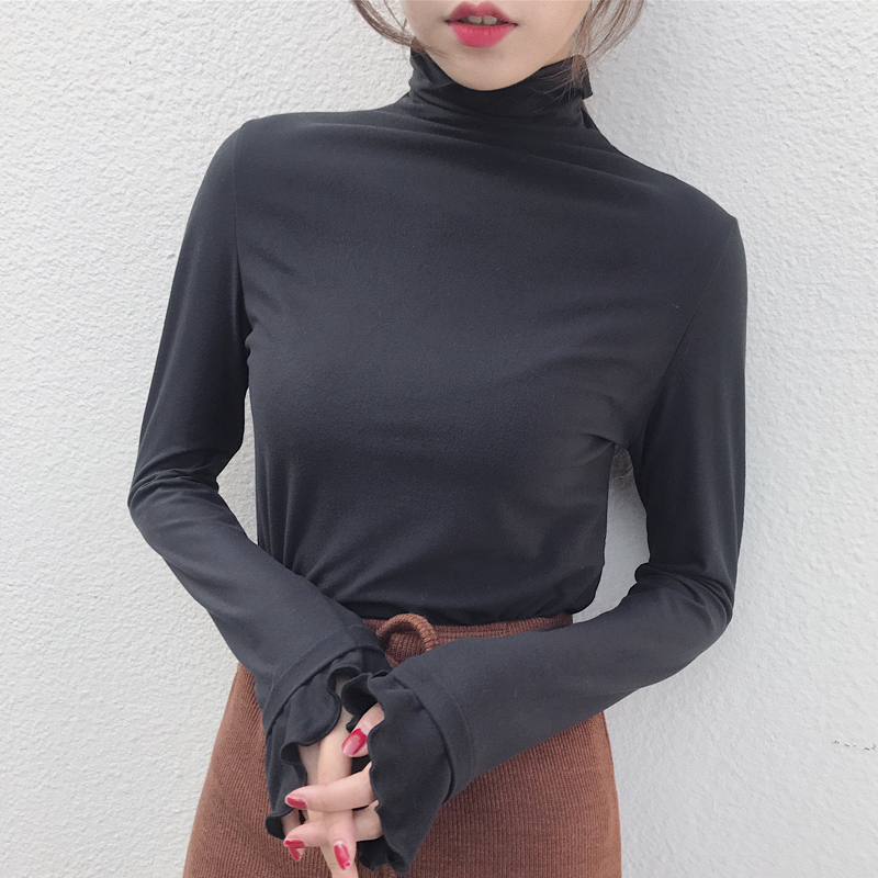 韓版時尚早秋上衣女慵懶修身顯瘦波浪邊高領打底衫女長袖T恤上衣