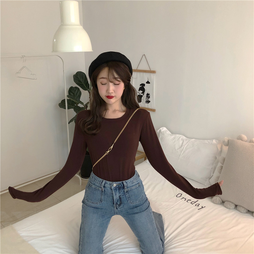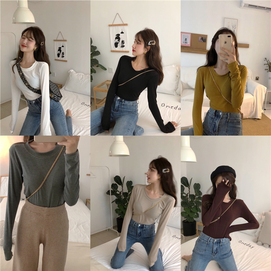 / 復古韓國chic多色基礎百搭圓領修身顯瘦彈力長袖打底衫T恤女新款