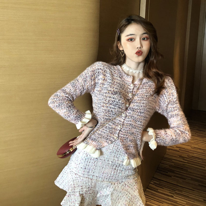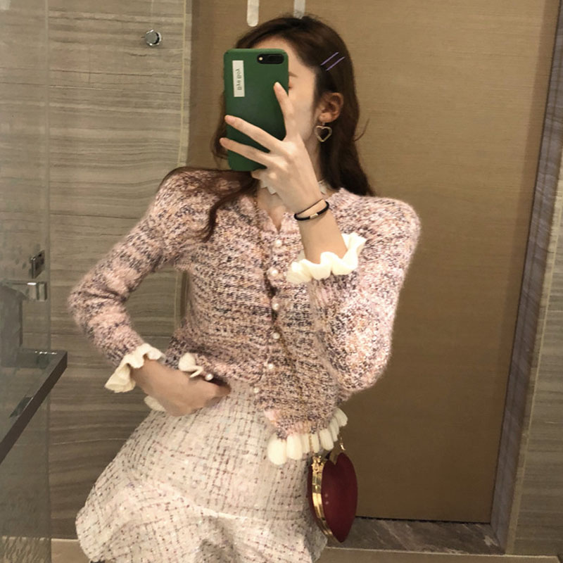 / 秋裝女2018新款套裝復古珠珠扣波浪邊香風開衫+小香風魚尾短呢裙