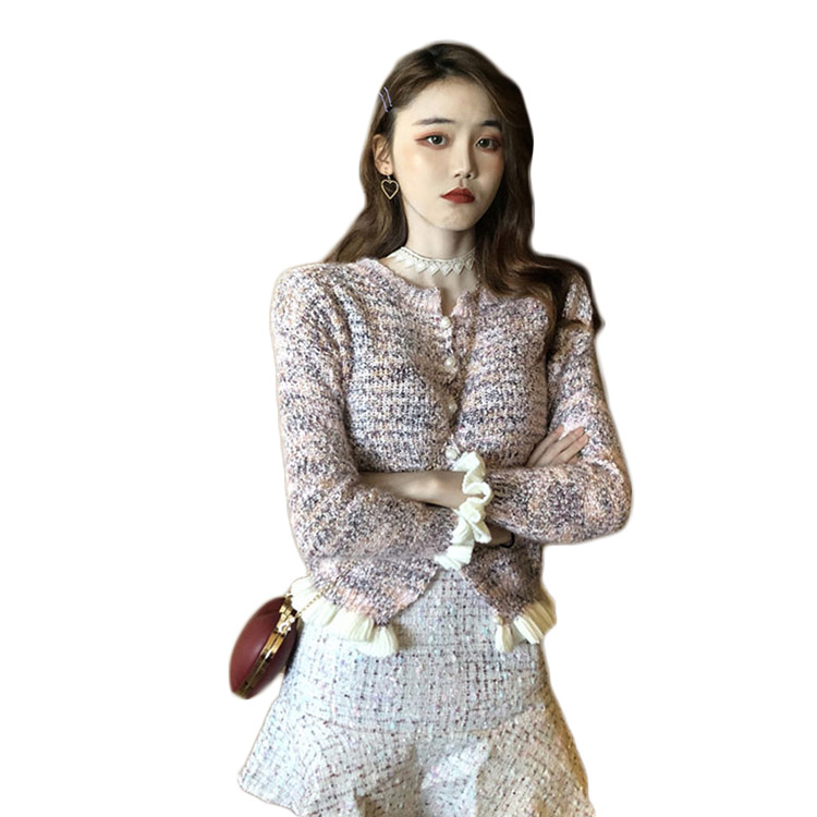 秋裝女2018新款套裝復古珠珠扣波浪邊香風開衫+小香風魚尾短呢裙