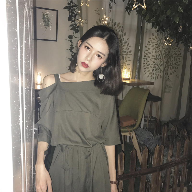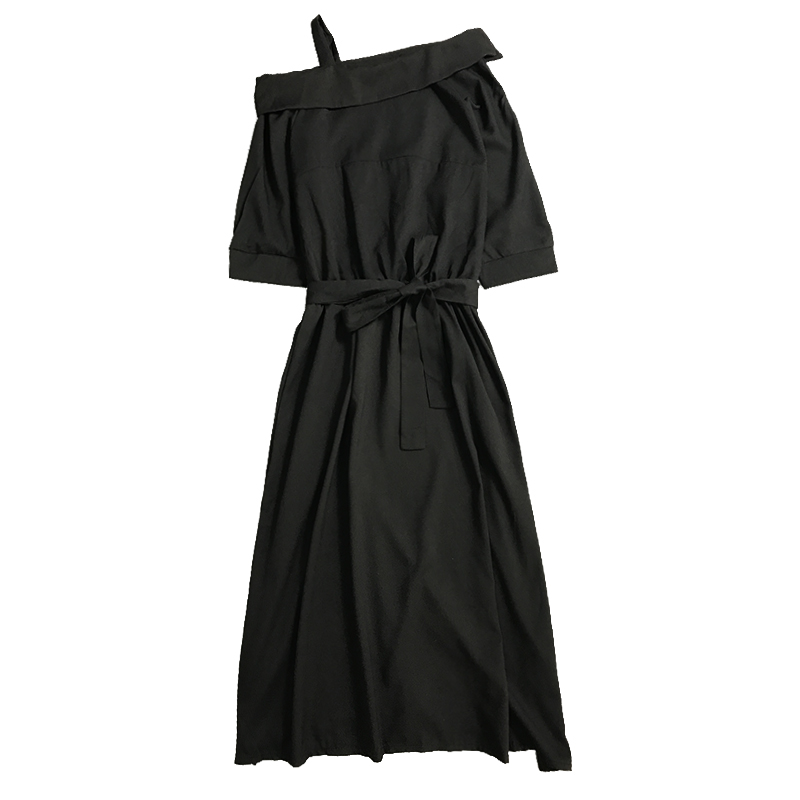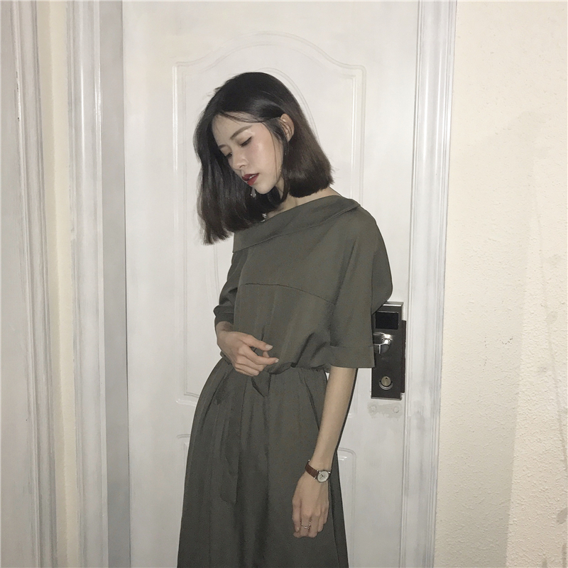 女秋裝2018新款純色系帶收腰斜領露肩吊帶中長款學生短袖連衣裙女
