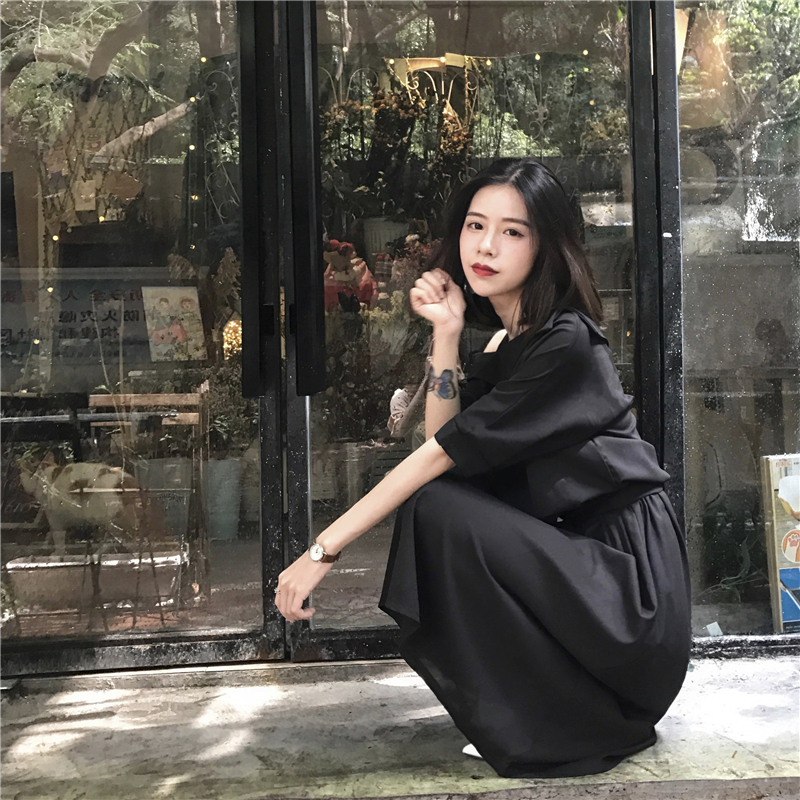 / 女秋裝2018新款純色系帶收腰斜領露肩吊帶中長款學生短袖連衣裙女