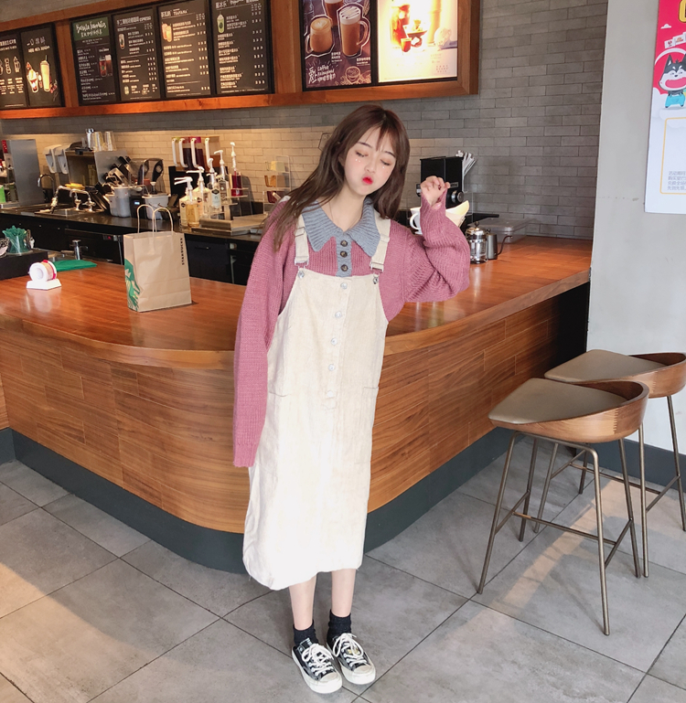 / 韓版時尚休閑套裝秋季撞色POLO領針織毛衣+燈芯絨背帶裙兩件套女