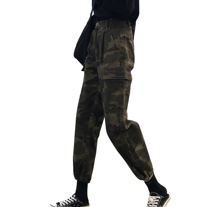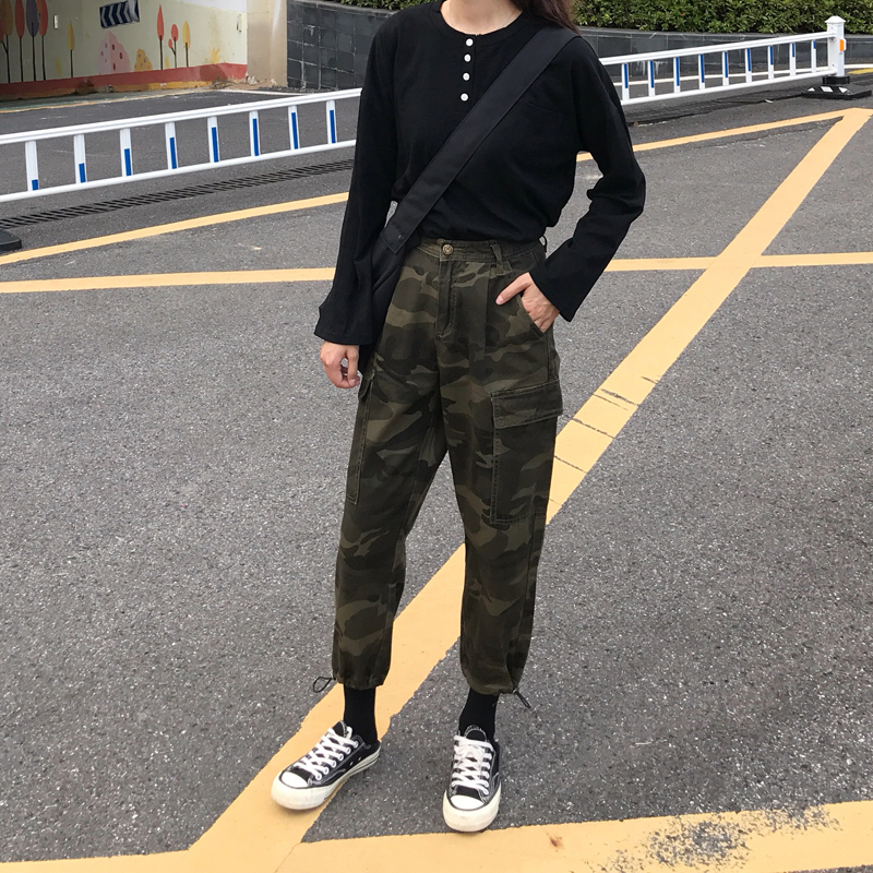 秋季女裝2018新款韓版BF風寬松迷彩休閑褲高腰哈倫褲工裝褲九分褲