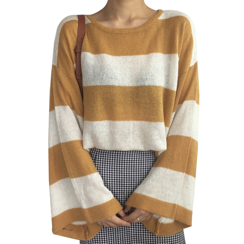 / 港味復古毛衣女2018新款條紋撞色寬松圓領針織衫顯瘦喇叭袖薄上衣