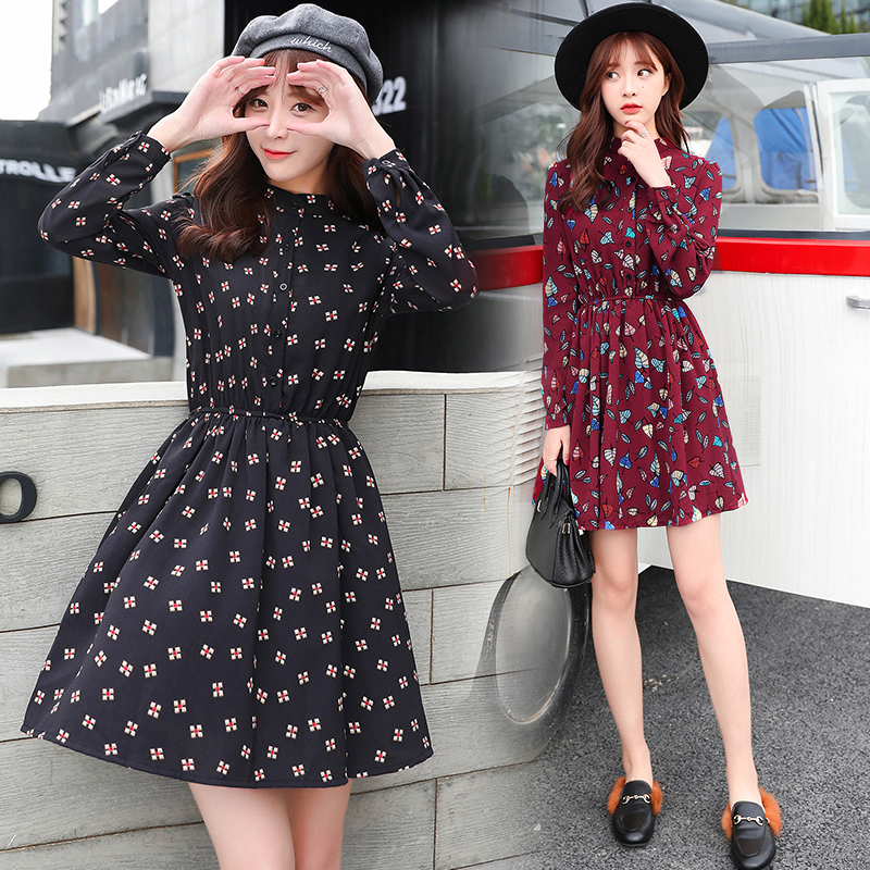 / 韓版春裝印花長袖連衣裙女雪紡碎花裙子大碼a字裙中長款夏小清新