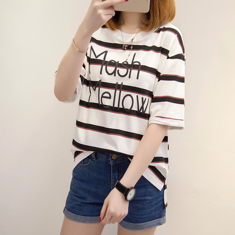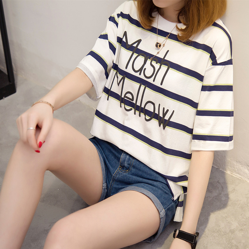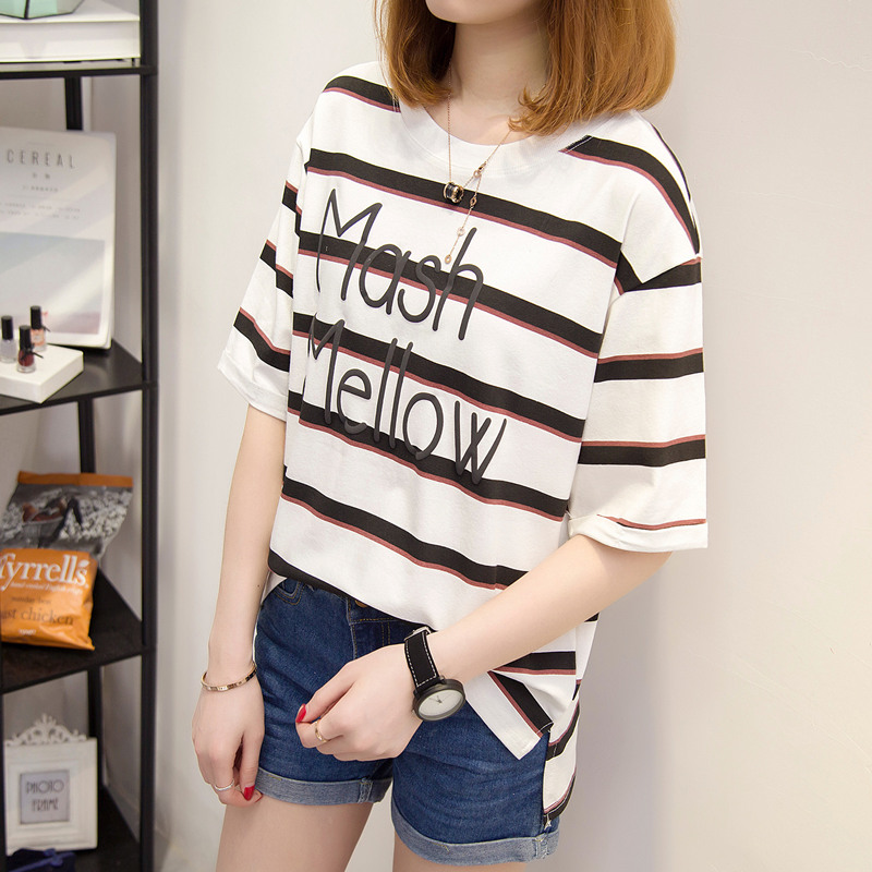 / 夏裝新款女裝條紋t恤女短袖寬松上衣女夏韓版打底體恤衫百搭