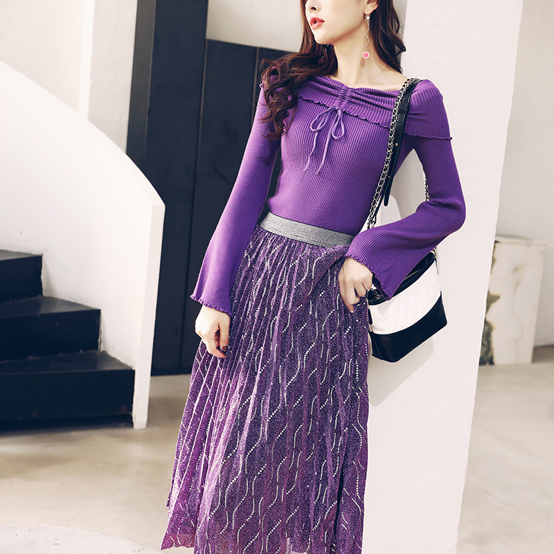 名媛氣質一字肩純色修身針織上衣網紗半身裙女2018早秋新款套裝潮