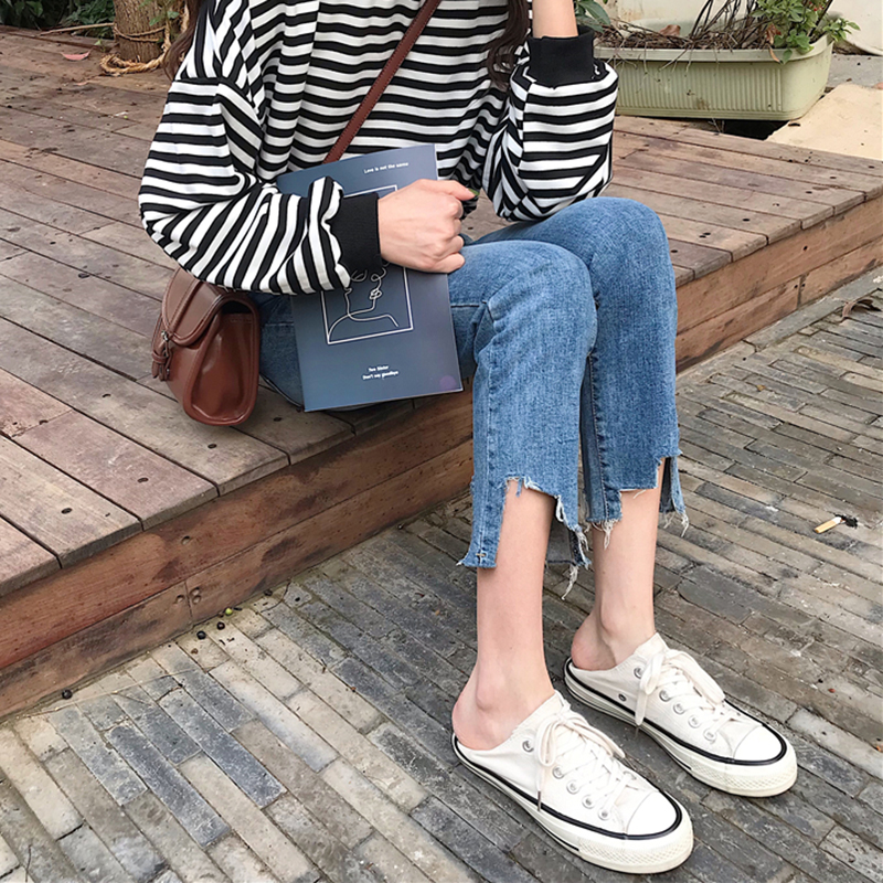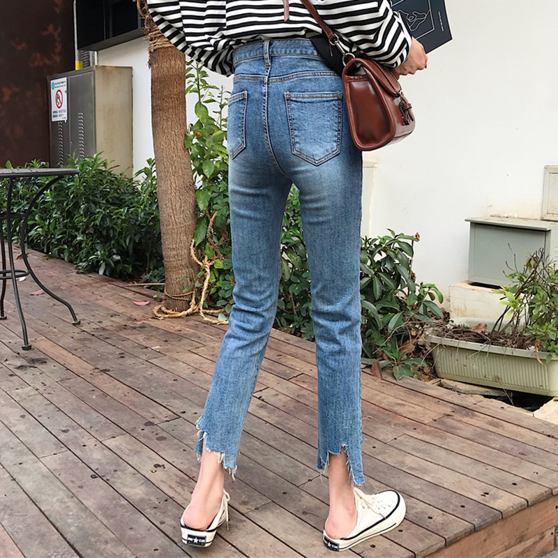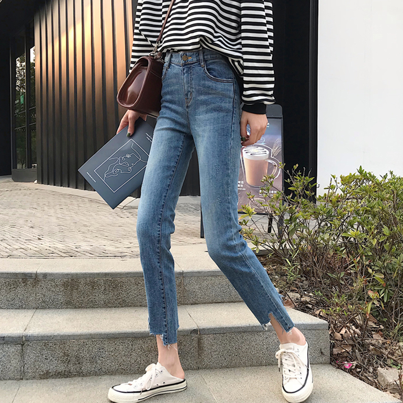 / 韓版不規則毛邊怪味牛仔褲女秋冬裝新款學生高腰顯瘦復古微喇褲子