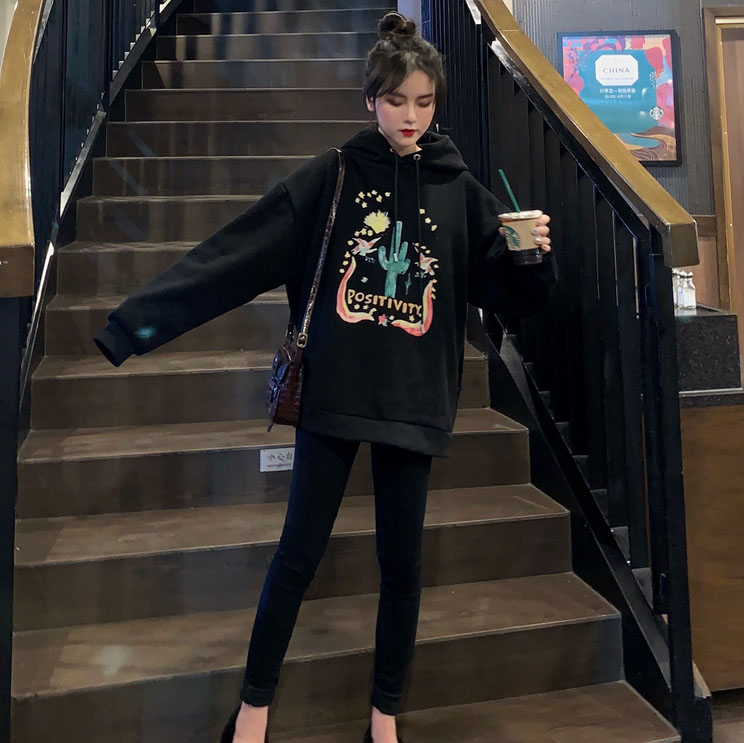 chic上衣慵懶風寬松衛衣女秋2018新款黑色中長款加絨加厚連帽衛衣