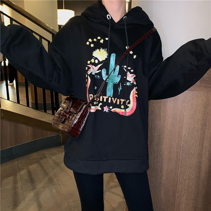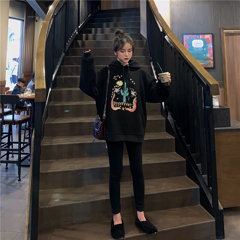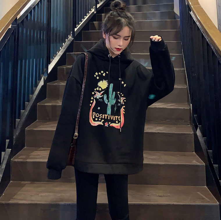 慵懶風上衣女寬松衛衣女秋2018新款中長款加絨加厚連帽衛衣外套女