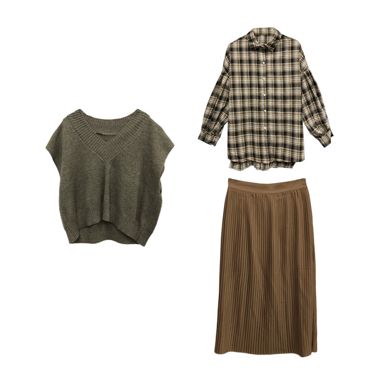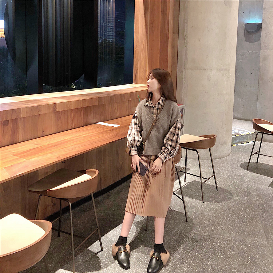 / 韓版時尚秋裝女2018新款套裝百搭格子襯衣+針織馬甲+百褶裙三件套
