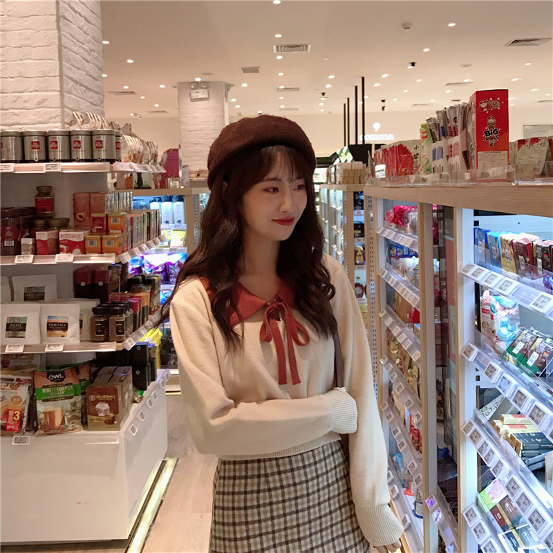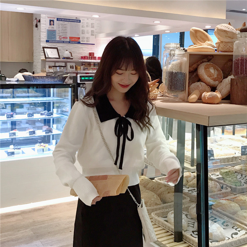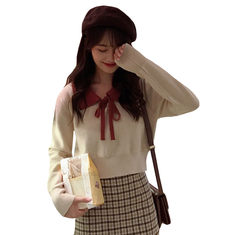 / 2018新款秋冬女裝韓版寬松系帶撞色翻領針織衫短款溫柔風毛衣上衣