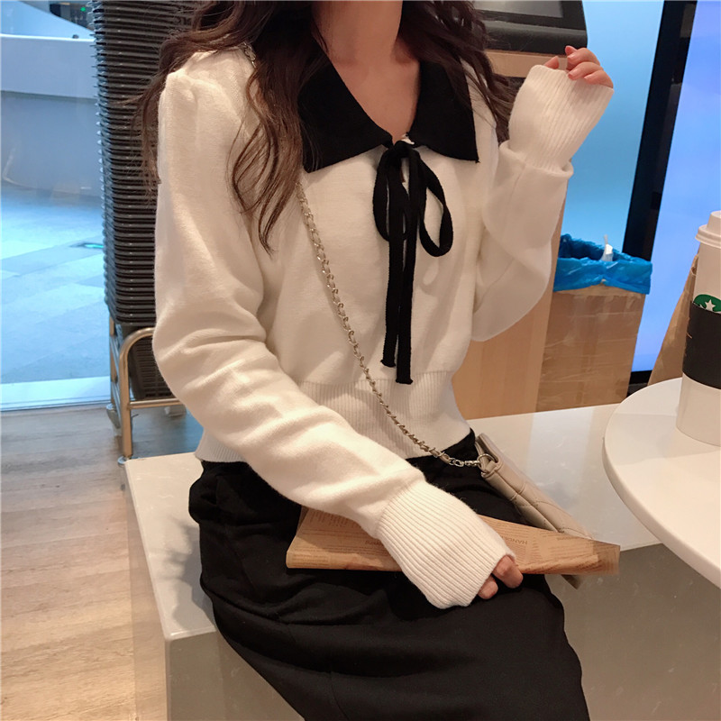2018新款秋冬女裝韓版寬松系帶撞色翻領針織衫短款溫柔風毛衣上衣