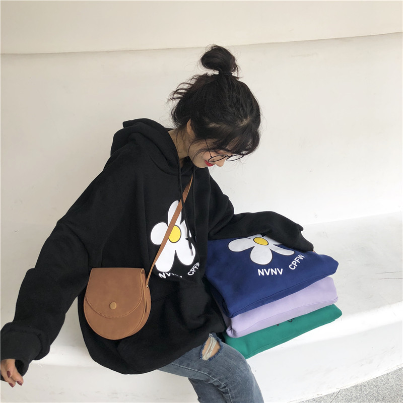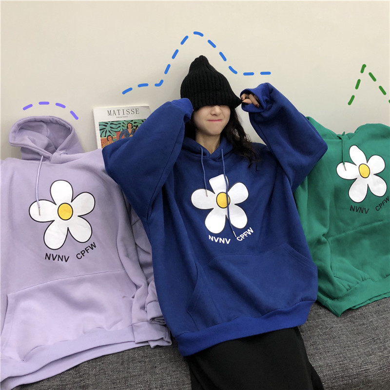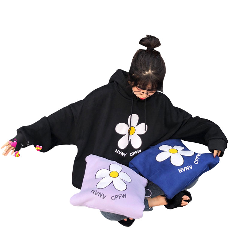 / 秋冬女裝韓版中長款慵懶風字母花朵寬松加絨加厚連帽衛衣上衣外套