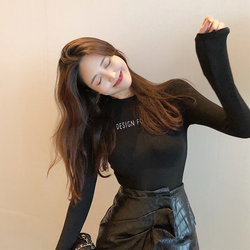 秋裝女2018新款修身顯瘦黑色長袖T恤韓版字母印花打底緊身上衣潮