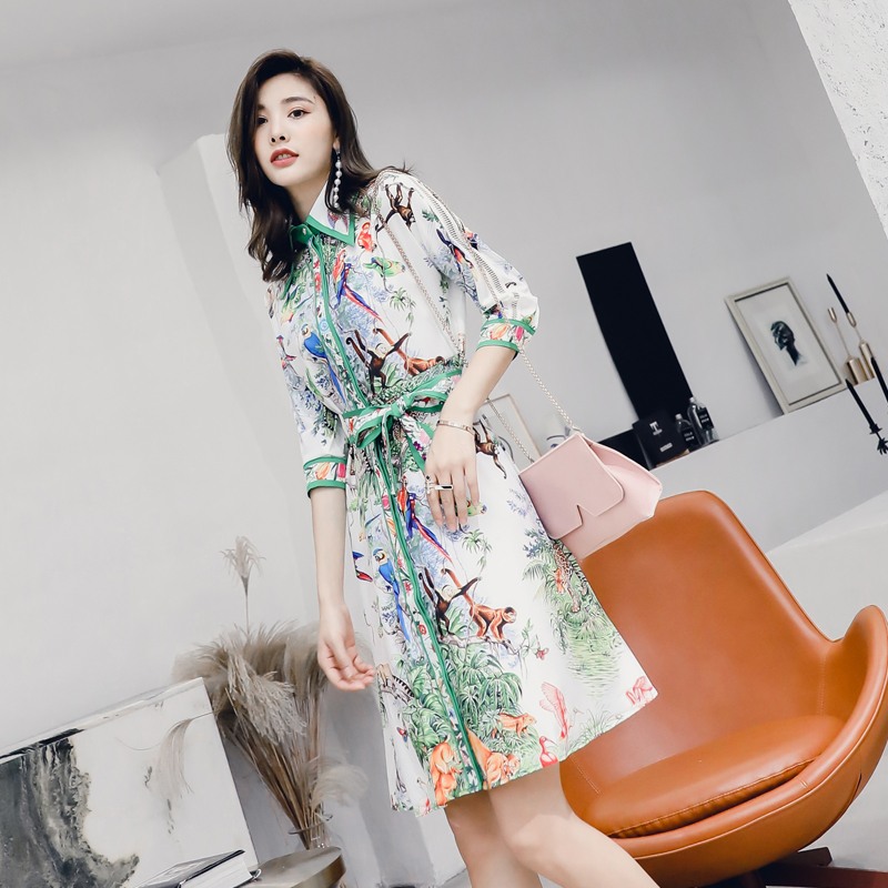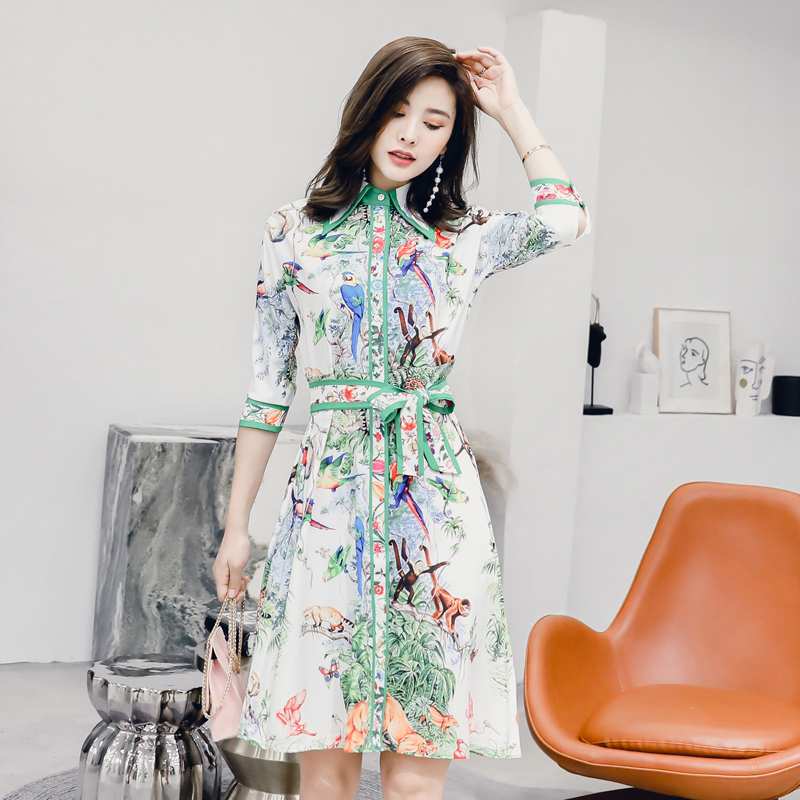 名媛淑女雪紡印花翻領襯衫式釘珠時尚中長連衣裙女夏2018新款裙子
