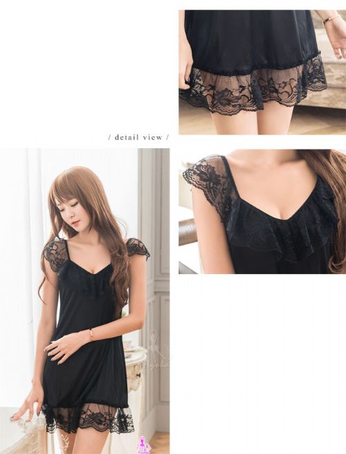 此款黑色蕾絲小蓋袖深V柔緞睡衣,